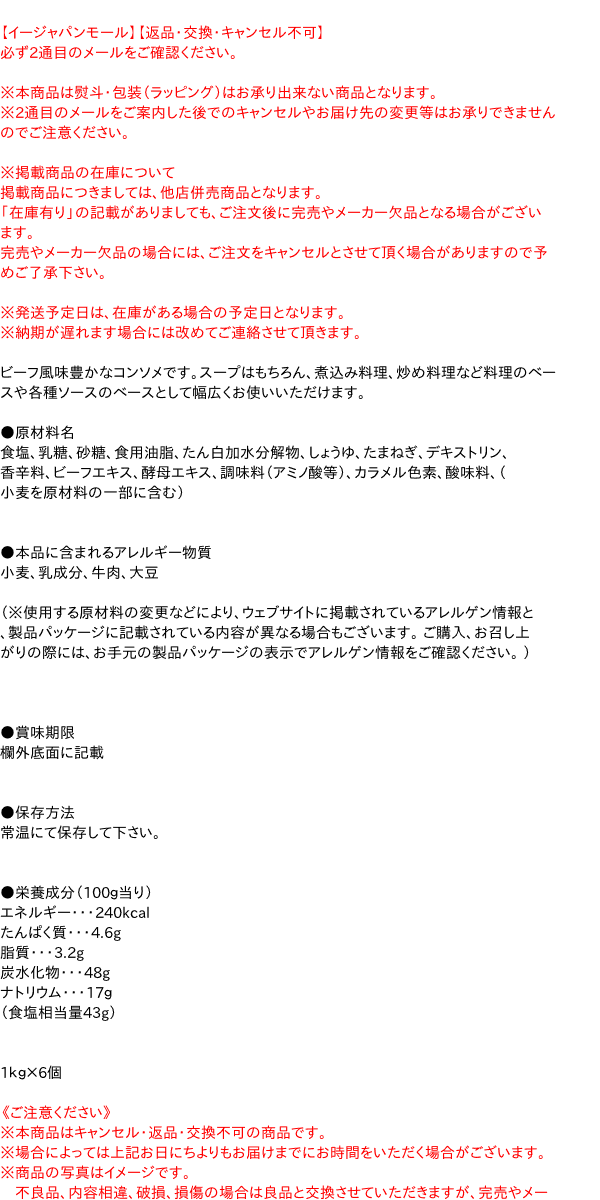 【イージャパンモール】【返品・交換・キャンセル不可】 必ず2通目のメールをご確認ください。 ※本商品は熨斗・包装(ラッピング)はお承り出来ない商品となります。 ※2通目のメールをご案内した後でのキャンセルやお届け先の変更等はお承りできませんのでご注意ください。※商品はご注文(ご決済)後、3-5営業日で発送(土・日・祝日除く)となります。※配送業者と契約がないため、送付先が北海道・沖縄・離島の場合キャンセルとさせていただきます。※掲載商品の在庫について 掲載商品につきましては、他店併売商品となります。 「在庫有り」の記載がありましても、ご注文後に完売やメーカー欠品となる場合がございます。 完売やメーカー欠品の場合には、ご注文をキャンセルとさせて頂く場合がありますので予めご了承下さい。 ※発送予定日は、在庫がある場合の予定日となります。 ※納期が遅れます場合には改めてご連絡させて頂きます。ビーフ風味豊かなコンソメです。スープはもちろん、煮込み料理、炒め料理など料理のベースや各種ソースのベースとして幅広くお使いいただけます。 ●原材料名 食塩、乳糖、砂糖、食用油脂、たん白加水分解物、しょうゆ、たまねぎ、デキストリン、香辛料、ビーフエキス、酵母エキス、調味料(アミノ酸等)、カラメル色素、酸味料、(小麦を原材料の一部に含む) ●本品に含まれるアレルギー物質 小麦、乳成分、牛肉、大豆 (※使用する原材料の変更などにより、ウェブサイトに掲載されているアレルゲン情報と、製品パッケージに記載されている内容が異なる場合もございます。 ご購入、お召し上がりの際には、お手元の製品パッケージの表示でアレルゲン情報をご確認ください。 ) ●賞味期限 欄外底面に記載 ●保存方法 常温にて保存して下さい。 ●栄養成分(100g当り) エネルギー・・・240kcal たんぱく質・・・4.6g 脂質・・・3.2g 炭水化物・・・48g ナトリウム・・・17g (食塩相当量43g) 1kg×6個【メーカー・製造または販売元】味の素株式会社03(5798)8637【広告文責】株式会社イージャパンアンドカンパニーズ 072-875-6666《ご注意ください》 ※本商品はキャンセル・返品・交換不可の商品です。 ※場合によっては上記お日にちよりもお届けまでにお時間をいただく場合がございます。 ※商品の写真はイメージです。 不良品、内容相違、破損、損傷の場合は良品と交換させていただきますが、完売やメーカー欠品などの場合にはご返金でのご対応とさせていただきます。 但し、商品到着から3日以内にご連絡をいただけない場合、ご対応致しかねます。 ※本商品は熨斗・包装(ラッピング)はお承り出来ない商品となります。 ※商品がリニューアルしている場合、リニューアル後の商品にてお届けとなる場合がございます。 リニューアルにより商品内容、容量、パッケージ等が異なる場合であってもキャンセル・返品・交換はお承りしておりません。 ※ご注文後、完売やメーカー欠品等の場合には該当商品をキャンセルとさせていただく場合がありますので予めご了承ください。[関連キーワード:調味料 ダシ スープ 煮込み ビーフ 業務用]クノール 味コンソメ 1Kg はコチラ >>