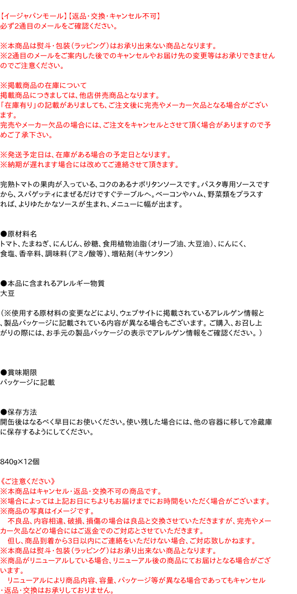 【イージャパンモール】【返品・交換・キャンセル不可】 必ず2通目のメールをご確認ください。 ※本商品は熨斗・包装(ラッピング)はお承り出来ない商品となります。 ※2通目のメールをご案内した後でのキャンセルやお届け先の変更等はお承りできませんのでご注意ください。※商品はご注文(ご決済)後、3-5営業日で発送(土・日・祝日除く)となります。※配送業者と契約がないため、送付先が北海道・沖縄・離島の場合キャンセルとさせていただきます。※送付先が東北の場合別途300円の送料を加算させていただきます。※掲載商品の在庫について 掲載商品につきましては、他店併売商品となります。 「在庫有り」の記載がありましても、ご注文後に完売やメーカー欠品となる場合がございます。 完売やメーカー欠品の場合には、ご注文をキャンセルとさせて頂く場合がありますので予めご了承下さい。 ※発送予定日は、在庫がある場合の予定日となります。 ※納期が遅れます場合には改めてご連絡させて頂きます。完熟トマトの果肉が入っている、コクのあるナポリタンソースです。パスタ専用ソースですから、スパゲッティにまぜるだけですぐテーブルへ。ベーコンやハム、野菜類をプラスすれば、よりゆたかなソースが生まれ、メニューに幅が出ます。 ●原材料名 トマト、たまねぎ、にんじん、砂糖、食用植物油脂(オリーブ油、大豆油)、にんにく、食塩、香辛料、調味料(アミノ酸等)、増粘剤(キサンタン) ●本品に含まれるアレルギー物質 大豆 (※使用する原材料の変更などにより、ウェブサイトに掲載されているアレルゲン情報と、製品パッケージに記載されている内容が異なる場合もございます。 ご購入、お召し上がりの際には、お手元の製品パッケージの表示でアレルゲン情報をご確認ください。 ) ●賞味期限 パッケージに記載 ●保存方法 開缶後はなるべく早目にお使いください。使い残した場合には、他の容器に移して冷蔵庫に保存するようにしてください。 840g×12個【メーカー・製造または販売元】カゴメ株式会社0120-401-831【広告文責】株式会社イージャパンアンドカンパニーズ 072-875-6666《ご注意ください》 ※本商品はキャンセル・返品・交換不可の商品です。 ※場合によっては上記お日にちよりもお届けまでにお時間をいただく場合がございます。 ※商品の写真はイメージです。 不良品、内容相違、破損、損傷の場合は良品と交換させていただきますが、完売やメーカー欠品などの場合にはご返金でのご対応とさせていただきます。 但し、商品到着から3日以内にご連絡をいただけない場合、ご対応致しかねます。 ※本商品は熨斗・包装(ラッピング)はお承り出来ない商品となります。 ※商品がリニューアルしている場合、リニューアル後の商品にてお届けとなる場合がございます。 リニューアルにより商品内容、容量、パッケージ等が異なる場合であってもキャンセル・返品・交換はお承りしておりません。 ※ご注文後、完売やメーカー欠品等の場合には該当商品をキャンセルとさせていただく場合がありますので予めご了承ください。[関連キーワード:食品 完熟トマト 果肉 コク ナポリタン パスタ専用 業務用]