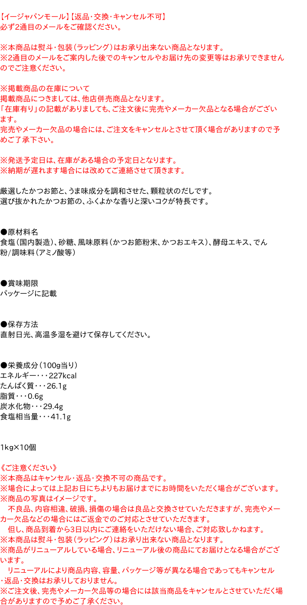【イージャパンモール】【返品・交換・キャンセル不可】 必ず2通目のメールをご確認ください。 ※本商品は熨斗・包装(ラッピング)はお承り出来ない商品となります。 ※2通目のメールをご案内した後でのキャンセルやお届け先の変更等はお承りできませんのでご注意ください。※商品はご注文(ご決済)後、3-5営業日で発送(土・日・祝日除く)となります。※配送業者と契約がないため、送付先が北海道・沖縄・離島の場合キャンセルとさせていただきます。※送付先が東北の場合別途300円の送料を加算させていただきます。※掲載商品の在庫について 掲載商品につきましては、他店併売商品となります。 「在庫有り」の記載がありましても、ご注文後に完売やメーカー欠品となる場合がございます。 完売やメーカー欠品の場合には、ご注文をキャンセルとさせて頂く場合がありますので予めご了承下さい。 ※発送予定日は、在庫がある場合の予定日となります。 ※納期が遅れます場合には改めてご連絡させて頂きます。厳選したかつお節と、うま味成分を調和させた、顆粒状のだしです。 選び抜かれたかつお節の、ふくよかな香りと深いコクが特長です。 ●原材料名 食塩(国内製造)、砂糖、風味原料(かつお節粉末、かつおエキス)、酵母エキス、でん粉/調味料(アミノ酸等) ●賞味期限 パッケージに記載 ●保存方法 直射日光、高温多湿を避けて保存してください。 ●栄養成分(100g当り) エネルギー・・・227kcal たんぱく質・・・26.1g 脂質・・・0.6g 炭水化物・・・29.4g 食塩相当量・・・41.1g 1kg×10個【メーカー・製造または販売元】理研ビタミン株式会社0120-831-009【広告文責】株式会社イージャパンアンドカンパニーズ 072-875-6666《ご注意ください》 ※本商品はキャンセル・返品・交換不可の商品です。 ※場合によっては上記お日にちよりもお届けまでにお時間をいただく場合がございます。 ※商品の写真はイメージです。 不良品、内容相違、破損、損傷の場合は良品と交換させていただきますが、完売やメーカー欠品などの場合にはご返金でのご対応とさせていただきます。 但し、商品到着から3日以内にご連絡をいただけない場合、ご対応致しかねます。 ※本商品は熨斗・包装(ラッピング)はお承り出来ない商品となります。 ※商品がリニューアルしている場合、リニューアル後の商品にてお届けとなる場合がございます。 リニューアルにより商品内容、容量、パッケージ等が異なる場合であってもキャンセル・返品・交換はお承りしておりません。 ※ご注文後、完売やメーカー欠品等の場合には該当商品をキャンセルとさせていただく場合がありますので予めご了承ください。[関連キーワード:調味料 ダシ 出汁 顆粒 かつお カツオ かつお風味 和風 和食 業務用]