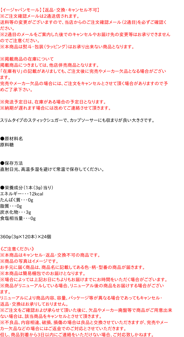 【イージャパンモール】【返品・交換・キャンセル不可】 ※ご注文確認メールは2通送信されます。 送料等の変更がございますので、当店からのご注文確認メール(2通目)を必ずご確認ください。 ※2通目のメールをご案内した後でのキャンセルやお届け先の変更等はお承りできませんのでご注意ください。 ※本商品は熨斗・包装(ラッピング)はお承り出来ない商品となります。※商品はご注文(ご決済)後、5-7営業日で発送(土・日・祝日除く)となります。※配送業者と契約がないため、送付先が北海道・沖縄・離島の場合キャンセルとさせていただきます。※送付先が東北の場合別途300円の送料を加算させていただきます。※掲載商品の在庫について 掲載商品につきましては、他店併売商品となります。 「在庫有り」の記載がありましても、ご注文後に完売やメーカー欠品となる場合がございます。 完売やメーカー欠品の場合には、ご注文をキャンセルとさせて頂く場合がありますので予めご了承下さい。 ※発送予定日は、在庫がある場合の予定日となります。 ※納期が遅れます場合には改めてご連絡させて頂きます。スリムタイプのスティックシュガーで、カップソーサーにも収まりが良い大きさです。 ●原材料名 原料糖 ●保存方法 直射日光、高温多湿を避けて常温で保存してください。 ●栄養成分(1本(3g)当り) エネルギー・・・12kcal たんぱく質・・・0g 脂質・・・0g 炭水化物・・・3g 食塩相当量・・・0g 360g(3g×120本)×24個【メーカー・製造または販売元】株式会社パールエース0120-310-673【広告文責】株式会社イージャパンアンドカンパニーズ 072-875-6666《ご注意ください》 ※本商品はキャンセル・返品・交換不可の商品です。 ※商品の写真はイメージです。 お手元に届く商品は、商品名に記載してある色・柄・型番の商品が届きます。 ※本商品は簡易梱包でのお届けとなります。 ※場合によっては上記お日にちよりもお届けまでにお時間をいただく場合がございます。 ※商品がリニューアルしている場合、リニューアル後の商品をお届けする場合がございます。 リニューアルにより商品内容、容量、パッケージ等が異なる場合であってもキャンセル・返品・交換はお承りしておりません。 ※ご注文をご確認および承らせて頂いた後に、欠品やメーカー廃盤等で商品がご用意出来ない場合は、該当商品をキャンセルとさせて頂きます。 ※不良品、内容相違、破損、損傷の場合は良品と交換させていただきますが、完売やメーカー欠品などの場合にはご返金でのご対応とさせていただきます。 但し、商品到着から3日以内にご連絡をいただけない場合、ご対応致しかねます。[関連キーワード:調味料 砂糖 さとう シュガー グラニュー糖 コーヒー 紅茶 甘味 スティック]【イージャパンショッピングモール】内のみのお買い物は、送料一律でどれだけ買っても同梱する事が出来ます。※ただし、一部地域(北海道・東北・沖縄)は除きます。※商品に記載されています【イージャパンショッピングモール】の表記を必ずご確認下さい。【イージャパンショッピングモール】の表記以外で記載されている商品に関しまして、一緒にお買い物は出来ますが、別途送料を頂戴します。また、別便でのお届けとなりますのでご了承下さい。※全商品、各商品説明に記載されています注意書きを必ずお読み下さい。※それぞれの【○○館】ごとに、送料等ルールが異なりますので、ご注意下さい。※ご注文確認メールは2通送信されます。送料等の変更がございますので、当店からのご注文確認メール(2通目)を必ずご確認ください。