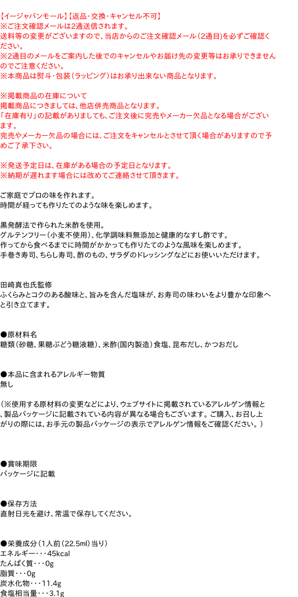 【イージャパンモール】【返品・交換・キャンセル不可】 ※ご注文確認メールは2通送信されます。 送料等の変更がございますので、当店からのご注文確認メール(2通目)を必ずご確認ください。 ※2通目のメールをご案内した後でのキャンセルやお届け先の変更等はお承りできませんのでご注意ください。 ※本商品は熨斗・包装(ラッピング)はお承り出来ない商品となります。※商品はご注文(ご決済)後、5-7営業日で発送(土・日・祝日除く)となります。※配送業者と契約がないため、送付先が北海道・沖縄・離島の場合キャンセルとさせていただきます。※本商品は2ケース(24点)ごとに別途送料を頂戴いたします。※掲載商品の在庫について 掲載商品につきましては、他店併売商品となります。 「在庫有り」の記載がありましても、ご注文後に完売やメーカー欠品となる場合がございます。 完売やメーカー欠品の場合には、ご注文をキャンセルとさせて頂く場合がありますので予めご了承下さい。 ※発送予定日は、在庫がある場合の予定日となります。 ※納期が遅れます場合には改めてご連絡させて頂きます。ご家庭でプロの味を作れます。 時間が経っても作りたてのような味を楽しめます。 黒発酵法で作られた米酢を使用。 グルテンフリー(小麦不使用)、化学調味料無添加と健康的なすし酢です。 作ってから食べるまでに時間がかかっても作りたてのような風味を楽しめます。 手巻き寿司、ちらし寿司、酢のもの、サラダのドレッシングなどにお使いいただけます。 田崎真也氏監修 ふくらみとコクのある酸味と、旨みを含んだ塩味が、お寿司の味わいをより豊かな印象へと引き立てます。 ●原材料名 糖類(砂糖、果糖ぶどう糖液糖)、米酢(国内製造)食塩、昆布だし、かつおだし ●本品に含まれるアレルギー物質 無し (※使用する原材料の変更などにより、ウェブサイトに掲載されているアレルゲン情報と、製品パッケージに記載されている内容が異なる場合もございます。 ご購入、お召し上がりの際には、お手元の製品パッケージの表示でアレルゲン情報をご確認ください。 ) ●賞味期限 パッケージに記載 ●保存方法 直射日光を避け、常温で保存してください。 ●栄養成分(1人前(22.5ml)当り) エネルギー・・・45kcal たんぱく質・・・0g 脂質・・・0g 炭水化物・・・11.4g 食塩相当量・・・3.1g 360ml×12個【メーカー・製造または販売元】タマノイ酢株式会社0120-33-4104【広告文責】株式会社イージャパンアンドカンパニーズ 072-875-6666《ご注意ください》 ※本商品はキャンセル・返品・交換不可の商品です。 ※商品の写真はイメージです。 お手元に届く商品は、商品名に記載してある色・柄・型番の商品が届きます。 ※本商品は簡易梱包でのお届けとなります。 ※場合によっては上記お日にちよりもお届けまでにお時間をいただく場合がございます。 ※商品がリニューアルしている場合、リニューアル後の商品をお届けする場合がございます。 リニューアルにより商品内容、容量、パッケージ等が異なる場合であってもキャンセル・返品・交換はお承りしておりません。 ※ご注文をご確認および承らせて頂いた後に、欠品やメーカー廃盤等で商品がご用意出来ない場合は、該当商品をキャンセルとさせて頂きます。 ※不良品、内容相違、破損、損傷の場合は良品と交換させていただきますが、完売やメーカー欠品などの場合にはご返金でのご対応とさせていただきます。 但し、商品到着から3日以内にご連絡をいただけない場合、ご対応致しかねます。[関連キーワード:調味料 すし スシ 寿司 南蛮漬け マリネ 便利 簡単 合わせ酢]【イージャパンショッピングモール】内のみのお買い物は、送料一律でどれだけ買っても同梱する事が出来ます。※ただし、一部地域(北海道・東北・沖縄)は除きます。※商品に記載されています【イージャパンショッピングモール】の表記を必ずご確認下さい。【イージャパンショッピングモール】の表記以外で記載されている商品に関しまして、一緒にお買い物は出来ますが、別途送料を頂戴します。また、別便でのお届けとなりますのでご了承下さい。※全商品、各商品説明に記載されています注意書きを必ずお読み下さい。※それぞれの【○○館】ごとに、送料等ルールが異なりますので、ご注意下さい。※ご注文確認メールは2通送信されます。送料等の変更がございますので、当店からのご注文確認メール(2通目)を必ずご確認ください。