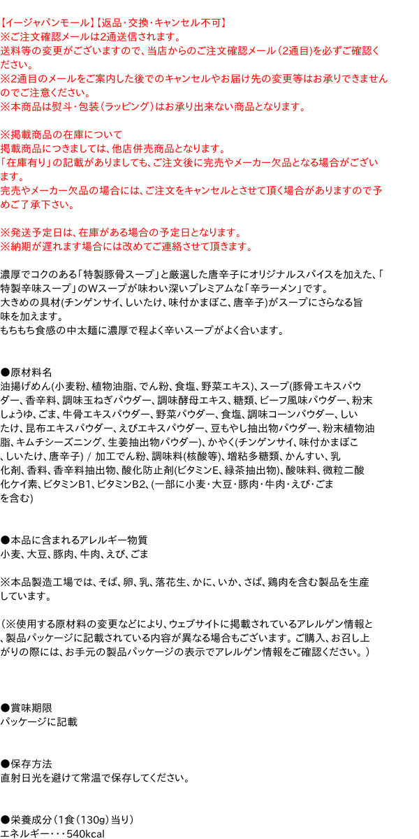 【イージャパンモール】【返品・交換・キャンセル不可】 ※ご注文確認メールは2通送信されます。 送料等の変更がございますので、当店からのご注文確認メール(2通目)を必ずご確認ください。 ※2通目のメールをご案内した後でのキャンセルやお届け先の変更等はお承りできませんのでご注意ください。 ※本商品は熨斗・包装(ラッピング)はお承り出来ない商品となります。※商品はご注文(ご決済)後、5-7営業日で発送(土・日・祝日除く)となります。※配送業者と契約がないため、送付先が北海道・沖縄・離島の場合キャンセルとさせていただきます。※送付先が東北の場合別途300円の送料を加算させていただきます。※掲載商品の在庫について 掲載商品につきましては、他店併売商品となります。 「在庫有り」の記載がありましても、ご注文後に完売やメーカー欠品となる場合がございます。 完売やメーカー欠品の場合には、ご注文をキャンセルとさせて頂く場合がありますので予めご了承下さい。 ※発送予定日は、在庫がある場合の予定日となります。 ※納期が遅れます場合には改めてご連絡させて頂きます。濃厚でコクのある「特製豚骨スープ」と厳選した唐辛子にオリジナルスパイスを加えた、「特製辛味スープ」のWスープが味わい深いプレミアムな「辛ラーメン」です。 大きめの具材(チンゲンサイ、しいたけ、味付かまぼこ、唐辛子)がスープにさらなる旨味を加えます。 もちもち食感の中太麺に濃厚で程よく辛いスープがよく合います。 ●原材料名 油揚げめん(小麦粉、植物油脂、でん粉、食塩、野菜エキス)、スープ(豚骨エキスパウダー、香辛料、調味玉ねぎパウダー、調味酵母エキス、糖類、ビーフ風味パウダー、粉末しょうゆ、ごま、牛骨エキスパウダー、野菜パウダー、食塩、調味コーンパウダー、しいたけ、昆布エキスパウダー、えびエキスパウダー、豆もやし抽出物パウダー、粉末植物油脂、キムチシーズニング、生姜抽出物パウダー)、かやく(チンゲンサイ、味付かまぼこ、しいたけ、唐辛子) / 加工でん粉、調味料(核酸等)、増粘多糖類、かんすい、乳化剤、香料、香辛料抽出物、酸化防止剤(ビタミンE、緑茶抽出物)、酸味料、微粒二酸化ケイ素、ビタミンB1、ビタミンB2、(一部に小麦・大豆・豚肉・牛肉・えび・ごまを含む) ●本品に含まれるアレルギー物質 小麦、大豆、豚肉、牛肉、えび、ごま ※本品製造工場では、そば、卵、乳、落花生、かに、いか、さば、鶏肉を含む製品を生産しています。 (※使用する原材料の変更などにより、ウェブサイトに掲載されているアレルゲン情報と、製品パッケージに記載されている内容が異なる場合もございます。 ご購入、お召し上がりの際には、お手元の製品パッケージの表示でアレルゲン情報をご確認ください。 ) ●賞味期限 パッケージに記載 ●保存方法 直射日光を避けて常温で保存してください。 ●栄養成分(1食(130g)当り) エネルギー・・・540kcal (めん・かやく・・・427g) (スープ・・・73g) たんぱく質・・・11.6g 脂質・・・15.6g 炭水化物・・・88.2g 食塩相当量・・・5.0g (めん・かやく・・・2.4g) (スープ・・・2.6g) ビタミンB1・・・5.74mg ビタミンB2・・・1.07mg 130g×3食×12個【メーカー・製造または販売元】株式会社農心ジャパン03-3595-0882【原産国】韓国【広告文責】株式会社イージャパンアンドカンパニーズ 072-875-6666《ご注意ください》 ※本商品はキャンセル・返品・交換不可の商品です。 ※商品の写真はイメージです。 お手元に届く商品は、商品名に記載してある色・柄・型番の商品が届きます。 ※本商品は簡易梱包でのお届けとなります。 ※場合によっては上記お日にちよりもお届けまでにお時間をいただく場合がございます。 ※商品がリニューアルしている場合、リニューアル後の商品をお届けする場合がございます。 リニューアルにより商品内容、容量、パッケージ等が異なる場合であってもキャンセル・返品・交換はお承りしておりません。 ※ご注文をご確認および承らせて頂いた後に、欠品やメーカー廃盤等で商品がご用意出来ない場合は、該当商品をキャンセルとさせて頂きます。 ※不良品、内容相違、破損、損傷の場合は良品と交換させていただきますが、完売やメーカー欠品などの場合にはご返金でのご対応とさせていただきます。 但し、商品到着から3日以内にご連絡をいただけない場合、ご対応致しかねます。[関連キーワード:食品 即席めん 中華めん 袋麺 インスタント麺 韓国 らーめん]【イージャパンショッピングモール】内のみのお買い物は、送料一律でどれだけ買っても同梱する事が出来ます。※ただし、一部地域(北海道・東北・沖縄)は除きます。※商品に記載されています【イージャパンショッピングモール】の表記を必ずご確認下さい。【イージャパンショッピングモール】の表記以外で記載されている商品に関しまして、一緒にお買い物は出来ますが、別途送料を頂戴します。また、別便でのお届けとなりますので
