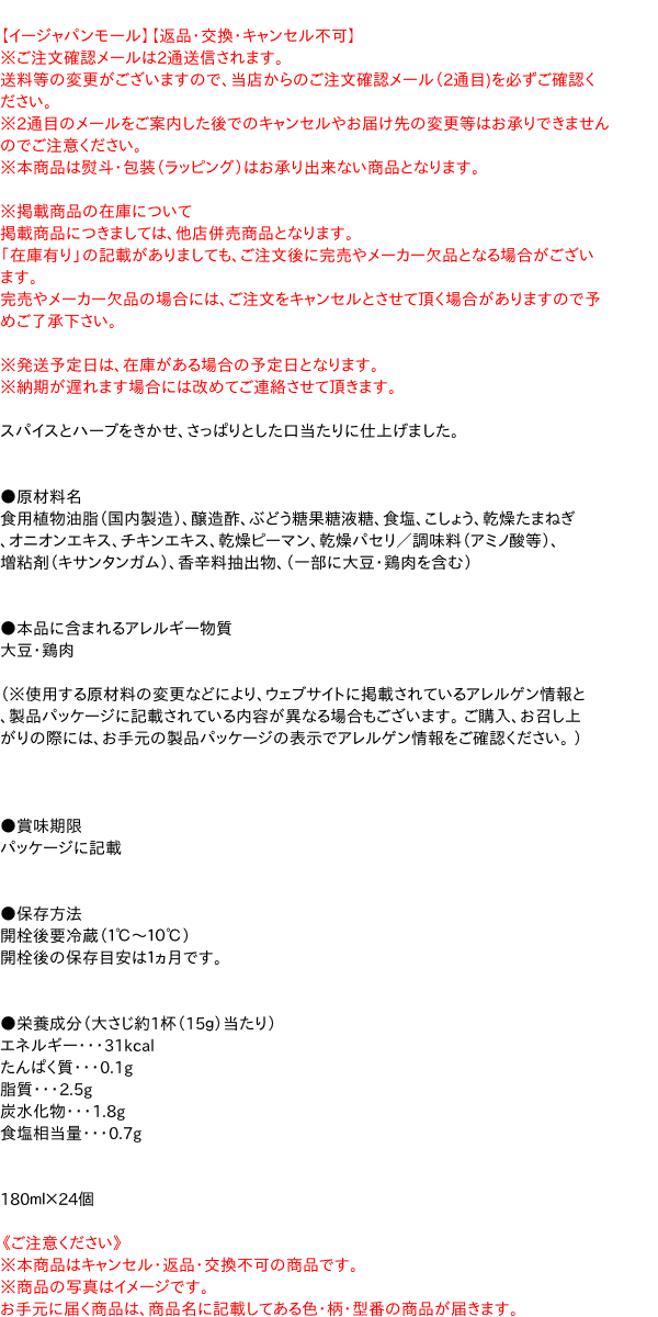 【イージャパンモール】【返品・交換・キャンセル不可】 ※ご注文確認メールは2通送信されます。 送料等の変更がございますので、当店からのご注文確認メール(2通目)を必ずご確認ください。 ※2通目のメールをご案内した後でのキャンセルやお届け先の変更等はお承りできませんのでご注意ください。 ※本商品は熨斗・包装(ラッピング)はお承り出来ない商品となります。※商品はご注文(ご決済)後、3-5営業日で発送(土・日・祝日除く)となります。※配送業者と契約がないため、送付先が北海道・沖縄・離島の場合キャンセルとさせていただきます。※掲載商品の在庫について 掲載商品につきましては、他店併売商品となります。 「在庫有り」の記載がありましても、ご注文後に完売やメーカー欠品となる場合がございます。 完売やメーカー欠品の場合には、ご注文をキャンセルとさせて頂く場合がありますので予めご了承下さい。 ※発送予定日は、在庫がある場合の予定日となります。 ※納期が遅れます場合には改めてご連絡させて頂きます。スパイスとハーブをきかせ、さっぱりとした口当たりに仕上げました。 ●原材料名 食用植物油脂(国内製造)、醸造酢、ぶどう糖果糖液糖、食塩、こしょう、乾燥たまねぎ、オニオンエキス、チキンエキス、乾燥ピーマン、乾燥パセリ/調味料(アミノ酸等)、増粘剤(キサンタンガム)、香辛料抽出物、(一部に大豆・鶏肉を含む) ●本品に含まれるアレルギー物質 大豆・鶏肉 (※使用する原材料の変更などにより、ウェブサイトに掲載されているアレルゲン情報と、製品パッケージに記載されている内容が異なる場合もございます。 ご購入、お召し上がりの際には、お手元の製品パッケージの表示でアレルゲン情報をご確認ください。 ) ●賞味期限 パッケージに記載 ●保存方法 開栓後要冷蔵(1℃〜10℃) 開栓後の保存目安は1ヵ月です。 ●栄養成分(大さじ約1杯(15g)当たり) エネルギー・・・31kcal たんぱく質・・・0.1g 脂質・・・2.5g 炭水化物・・・1.8g 食塩相当量・・・0.7g 180ml×24個【メーカー・製造または販売元】キューピー株式会社0120-14-1122【広告文責】株式会社イージャパンアンドカンパニーズ 072-875-6666《ご注意ください》 ※本商品はキャンセル・返品・交換不可の商品です。 ※商品の写真はイメージです。 お手元に届く商品は、商品名に記載してある色・柄・型番の商品が届きます。 ※本商品は簡易梱包でのお届けとなります。 ※場合によっては上記お日にちよりもお届けまでにお時間をいただく場合がございます。 ※商品がリニューアルしている場合、リニューアル後の商品をお届けする場合がございます。 リニューアルにより商品内容、容量、パッケージ等が異なる場合であってもキャンセル・返品・交換はお承りしておりません。 ※ご注文をご確認および承らせて頂いた後に、欠品やメーカー廃盤等で商品がご用意出来ない場合は、該当商品をキャンセルとさせて頂きます。 ※不良品、内容相違、破損、損傷の場合は良品と交換させていただきますが、完売やメーカー欠品などの場合にはご返金でのご対応とさせていただきます。 但し、商品到着から3日以内にご連絡をいただけない場合、ご対応致しかねます。[関連キーワード:調味料 ドレッシング サラダ タレ たれ 洋食 野菜]【イージャパンショッピングモール】内のみのお買い物は、送料一律でどれだけ買っても同梱する事が出来ます。※ただし、一部地域(北海道・東北・沖縄)は除きます。※商品に記載されています【イージャパンショッピングモール】の表記を必ずご確認下さい。【イージャパンショッピングモール】の表記以外で記載されている商品に関しまして、一緒にお買い物は出来ますが、別途送料を頂戴します。また、別便でのお届けとなりますのでご了承下さい。※全商品、各商品説明に記載されています注意書きを必ずお読み下さい。※それぞれの【○○館】ごとに、送料等ルールが異なりますので、ご注意下さい。※ご注文確認メールは2通送信されます。送料等の変更がございますので、当店からのご注文確認メール(2通目)を必ずご確認ください。