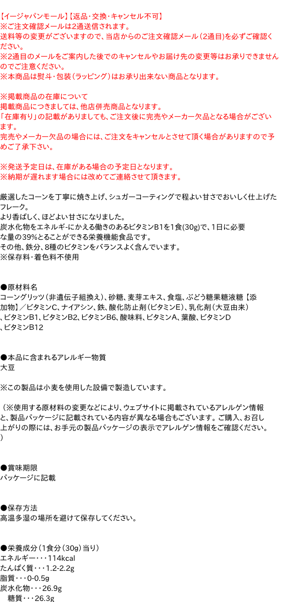【イージャパンモール】【返品・交換・キャンセル不可】 ※ご注文確認メールは2通送信されます。 送料等の変更がございますので、当店からのご注文確認メール(2通目)を必ずご確認ください。 ※2通目のメールをご案内した後でのキャンセルやお届け先の変更等はお承りできませんのでご注意ください。 ※本商品は熨斗・包装(ラッピング)はお承り出来ない商品となります。※商品はご注文(ご決済)後、3-5営業日で発送(土・日・祝日除く)となります。※配送業者と契約がないため、送付先が北海道・沖縄・離島の場合キャンセルとさせていただきます。※送付先が東北の場合別途300円の送料を加算させていただきます。※掲載商品の在庫について 掲載商品につきましては、他店併売商品となります。 「在庫有り」の記載がありましても、ご注文後に完売やメーカー欠品となる場合がございます。 完売やメーカー欠品の場合には、ご注文をキャンセルとさせて頂く場合がありますので予めご了承下さい。 ※発送予定日は、在庫がある場合の予定日となります。 ※納期が遅れます場合には改めてご連絡させて頂きます。厳選したコーンを丁寧に焼き上げ、シュガーコーティングで程よい甘さでおいしく仕上げたフレーク。 より香ばしく、ほどよい甘さになりました。 炭水化物をエネルギ-にかえる働きのあるビタミンB1を1食(30g)で、1日に必要な量の39%とることができる栄養機能食品です。 その他、鉄分、8種のビタミンをバランスよく含んでいます。 ※保存料・着色料不使用 ●原材料名 コーングリッツ(非遺伝子組換え)、砂糖、麦芽エキス、食塩、ぶどう糖果糖液糖 【添加物】/ビタミンC、ナイアシン、鉄、酸化防止剤(ビタミンE)、乳化剤(大豆由来)、ビタミンB1、ビタミンB2、ビタミンB6、酸味料、ビタミンA、葉酸、ビタミンD、ビタミンB12 ●本品に含まれるアレルギー物質 大豆 ※この製品は小麦を使用した設備で製造しています。 (※使用する原材料の変更などにより、ウェブサイトに掲載されているアレルゲン情報と、製品パッケージに記載されている内容が異なる場合もございます。 ご購入、お召し上がりの際には、お手元の製品パッケージの表示でアレルゲン情報をご確認ください。 ) ●賞味期限 パッケージに記載 ●保存方法 高温多湿の場所を避けて保存してください。 ●栄養成分(1食分(30g)当り) エネルギー・・・114kcal たんぱく質・・・1.2-2.2g 脂質・・・0-0.5g 炭水化物・・・26.9g 糖質・・・26.3g 食物繊維・・・0.4-2.0g 食塩相当量・・・0.3g カルシウム・・・0.5-2.5mg 鉄・・・1.4mg ビタミンA・・・53-139μg ビタミンB1・・・0.47mg ビタミンB2・・・0.42mg ナイアシン・・・4.2mg ビタミンB6・・・0.38mg ビタミンB12・・・0.4μg ビタミンC・・・15mg ビタミンD・・・0.59-1.53μg 葉酸・・・38μg 395g×6個【商品区分】栄養機能食品【メーカー・製造または販売元】日本ケロッグ合同会社0120-500209【原産国】日本【広告文責】株式会社イージャパンアンドカンパニーズ 072-875-6666《ご注意ください》 ※本商品はキャンセル・返品・交換不可の商品です。 ※商品の写真はイメージです。 お手元に届く商品は、商品名に記載してある色・柄・型番の商品が届きます。 ※本商品は簡易梱包でのお届けとなります。 ※場合によっては上記お日にちよりもお届けまでにお時間をいただく場合がございます。 ※商品がリニューアルしている場合、リニューアル後の商品をお届けする場合がございます。 リニューアルにより商品内容、容量、パッケージ等が異なる場合であってもキャンセル・返品・交換はお承りしておりません。 ※ご注文をご確認および承らせて頂いた後に、欠品やメーカー廃盤等で商品がご用意出来ない場合は、該当商品をキャンセルとさせて頂きます。 ※不良品、内容相違、破損、損傷の場合は良品と交換させていただきますが、完売やメーカー欠品などの場合にはご返金でのご対応とさせていただきます。 但し、商品到着から3日以内にご連絡をいただけない場合、ご対応致しかねます。[関連キーワード:食品 シリアル コーンフレーク 朝食 おやつ 牛乳 食物繊維 鉄分 ビタミン 業務用 栄養機能食品]【イージャパンショッピングモール】内のみのお買い物は、送料一律でどれだけ買っても同梱する事が出来ます。※ただし、一部地域(北海道・東北・沖縄)は除きます。※商品に記載されています【イージャパンショッピングモール】の表記を必ずご確認下さい。【イージャパンショッピングモール】の表記以外で記載されている商品に関しまして、一緒にお買い物は出来ますが、別途送料を頂戴します。また、別便でのお届けとなりますのでご了承下さい。※全商品、各商品説明に記載されています注意書きを必ずお読み下さい。※それぞれの【○○館】ごとに、送料等ルールが異なりますので、ご注意下さい。※ご注文確認メールは2通送信されます。送料等の変更がございますので、当店からのご注文確認メール(2通目)を必ずご確認くだ
