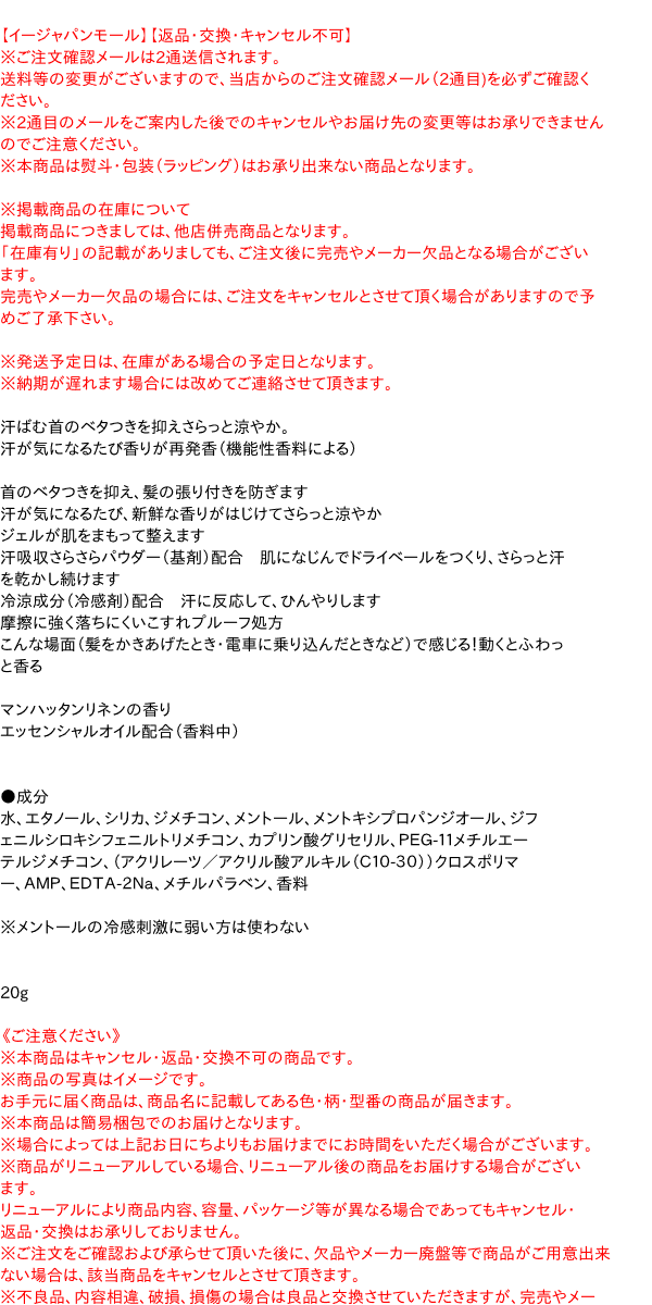 【イージャパンモール】【返品・交換・キャンセル不可】 ※ご注文確認メールは2通送信されます。 送料等の変更がございますので、当店からのご注文確認メール(2通目)を必ずご確認ください。 ※2通目のメールをご案内した後でのキャンセルやお届け先の変更等はお承りできませんのでご注意ください。 ※本商品は熨斗・包装(ラッピング)はお承り出来ない商品となります。※商品はご注文(ご決済)後、3-5営業日で発送(土・日・祝日除く)となります。※配送業者と契約がないため、送付先が北海道・沖縄・離島の場合キャンセルとさせていただきます。※掲載商品の在庫について 掲載商品につきましては、他店併売商品となります。 「在庫有り」の記載がありましても、ご注文後に完売やメーカー欠品となる場合がございます。 完売やメーカー欠品の場合には、ご注文をキャンセルとさせて頂く場合がありますので予めご了承下さい。 ※発送予定日は、在庫がある場合の予定日となります。 ※納期が遅れます場合には改めてご連絡させて頂きます。汗ばむ首のベタつきを抑えさらっと涼やか。 汗が気になるたび香りが再発香(機能性香料による) 首のベタつきを抑え、髪の張り付きを防ぎます 汗が気になるたび、新鮮な香りがはじけてさらっと涼やか ジェルが肌をまもって整えます 汗吸収さらさらパウダー(基剤)配合 肌になじんでドライベールをつくり、さらっと汗を乾かし続けます 冷涼成分(冷感剤)配合 汗に反応して、ひんやりします 摩擦に強く落ちにくいこすれプルーフ処方 こんな場面(髪をかきあげたとき・電車に乗り込んだときなど)で感じる!動くとふわっと香る マンハッタンリネンの香り エッセンシャルオイル配合(香料中) ●成分 水、エタノール、シリカ、ジメチコン、メントール、メントキシプロパンジオール、ジフェニルシロキシフェニルトリメチコン、カプリン酸グリセリル、PEG-11メチルエーテルジメチコン、(アクリレーツ/アクリル酸アルキル(C10-30))クロスポリマー、AMP、EDTA-2Na、メチルパラベン、香料 ※メントールの冷感刺激に弱い方は使わない 20g【メーカー・製造または販売元】花王株式会社0120-165-699【広告文責】株式会社イージャパンアンドカンパニーズ 072-875-6666《ご注意ください》 ※本商品はキャンセル・返品・交換不可の商品です。 ※商品の写真はイメージです。 お手元に届く商品は、商品名に記載してある色・柄・型番の商品が届きます。 ※本商品は簡易梱包でのお届けとなります。 ※場合によっては上記お日にちよりもお届けまでにお時間をいただく場合がございます。 ※商品がリニューアルしている場合、リニューアル後の商品をお届けする場合がございます。 リニューアルにより商品内容、容量、パッケージ等が異なる場合であってもキャンセル・返品・交換はお承りしておりません。 ※ご注文をご確認および承らせて頂いた後に、欠品やメーカー廃盤等で商品がご用意出来ない場合は、該当商品をキャンセルとさせて頂きます。 ※不良品、内容相違、破損、損傷の場合は良品と交換させていただきますが、完売やメーカー欠品などの場合にはご返金でのご対応とさせていただきます。 但し、商品到着から3日以内にご連絡をいただけない場合、ご対応致しかねます。[関連キーワード:エイトフォー ボディケア 制汗 デオドラント剤 首用 冷感]
