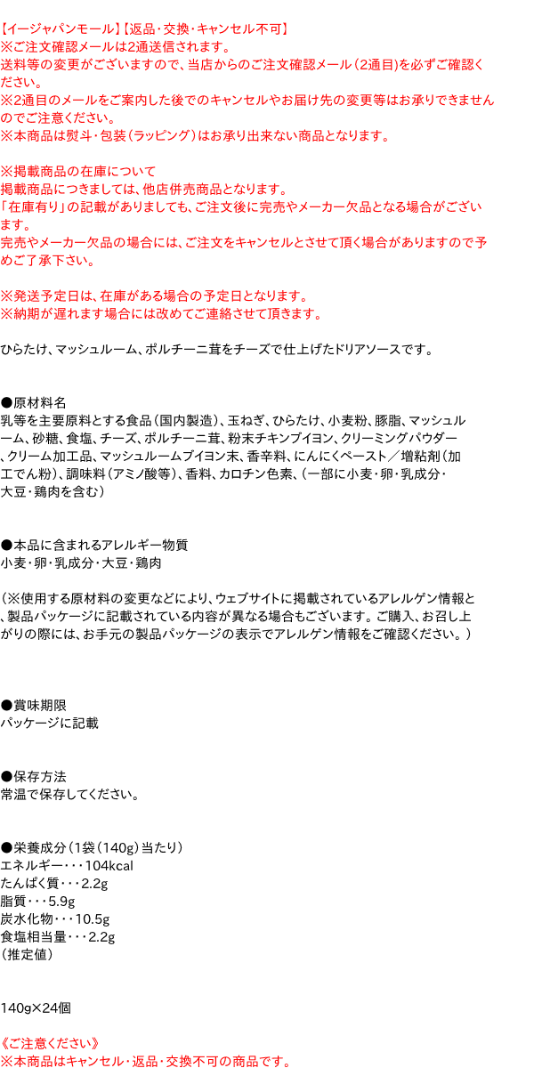 【イージャパンモール】【返品・交換・キャンセル不可】 ※ご注文確認メールは2通送信されます。 送料等の変更がございますので、当店からのご注文確認メール(2通目)を必ずご確認ください。 ※2通目のメールをご案内した後でのキャンセルやお届け先の変更等はお承りできませんのでご注意ください。 ※本商品は熨斗・包装(ラッピング)はお承り出来ない商品となります。※商品はご注文(ご決済)後、3-5営業日で発送(土・日・祝日除く)となります。※配送業者と契約がないため、送付先が北海道・沖縄・離島の場合キャンセルとさせていただきます。※掲載商品の在庫について 掲載商品につきましては、他店併売商品となります。 「在庫有り」の記載がありましても、ご注文後に完売やメーカー欠品となる場合がございます。 完売やメーカー欠品の場合には、ご注文をキャンセルとさせて頂く場合がありますので予めご了承下さい。 ※発送予定日は、在庫がある場合の予定日となります。 ※納期が遅れます場合には改めてご連絡させて頂きます。ひらたけ、マッシュルーム、ポルチーニ茸をチーズで仕上げたドリアソースです。 ●原材料名 乳等を主要原料とする食品(国内製造)、玉ねぎ、ひらたけ、小麦粉、豚脂、マッシュルーム、砂糖、食塩、チーズ、ポルチーニ茸、粉末チキンブイヨン、クリーミングパウダー、クリーム加工品、マッシュルームブイヨン末、香辛料、にんにくペースト/増粘剤(加工でん粉)、調味料(アミノ酸等)、香料、カロチン色素、(一部に小麦・卵・乳成分・大豆・鶏肉を含む) ●本品に含まれるアレルギー物質 小麦・卵・乳成分・大豆・鶏肉 (※使用する原材料の変更などにより、ウェブサイトに掲載されているアレルゲン情報と、製品パッケージに記載されている内容が異なる場合もございます。 ご購入、お召し上がりの際には、お手元の製品パッケージの表示でアレルゲン情報をご確認ください。 ) ●賞味期限 パッケージに記載 ●保存方法 常温で保存してください。 ●栄養成分(1袋(140g)当たり) エネルギー・・・104kcal たんぱく質・・・2.2g 脂質・・・5.9g 炭水化物・・・10.5g 食塩相当量・・・2.2g (推定値) 140g×24個【メーカー・製造または販売元】ハチ食品株式会社06-6471-3785【広告文責】株式会社イージャパンアンドカンパニーズ 072-875-6666《ご注意ください》 ※本商品はキャンセル・返品・交換不可の商品です。 ※商品の写真はイメージです。 お手元に届く商品は、商品名に記載してある色・柄・型番の商品が届きます。 ※本商品は簡易梱包でのお届けとなります。 ※場合によっては上記お日にちよりもお届けまでにお時間をいただく場合がございます。 ※商品がリニューアルしている場合、リニューアル後の商品をお届けする場合がございます。 リニューアルにより商品内容、容量、パッケージ等が異なる場合であってもキャンセル・返品・交換はお承りしておりません。 ※ご注文をご確認および承らせて頂いた後に、欠品やメーカー廃盤等で商品がご用意出来ない場合は、該当商品をキャンセルとさせて頂きます。 ※不良品、内容相違、破損、損傷の場合は良品と交換させていただきますが、完売やメーカー欠品などの場合にはご返金でのご対応とさせていただきます。 但し、商品到着から3日以内にご連絡をいただけない場合、ご対応致しかねます。[関連キーワード:食品 レトルト ドリアソース チーズ キノコ 1人前 パウチ食品]