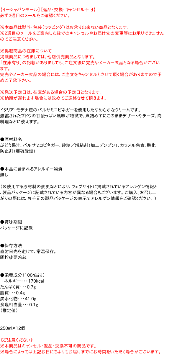 【イージャパンモール】【返品・交換・キャンセル不可】 必ず2通目のメールをご確認ください。 ※本商品は熨斗・包装(ラッピング)はお承り出来ない商品となります。 ※2通目のメールをご案内した後でのキャンセルやお届け先の変更等はお承りできませんのでご注意ください。※商品はご注文(ご決済)後、7-10営業日後で発送(土・日・祝日除く)となります。※配送業者と契約がないため、送付先が北海道・沖縄・離島の場合キャンセルとさせていただきます。※送付先が東北の場合別途300円の送料を加算させていただきます。※掲載商品の在庫について 掲載商品につきましては、他店併売商品となります。 「在庫有り」の記載がありましても、ご注文後に完売やメーカー欠品となる場合がございます。 完売やメーカー欠品の場合には、ご注文をキャンセルとさせて頂く場合がありますので予めご了承下さい。 ※発送予定日は、在庫がある場合の予定日となります。 ※納期が遅れます場合には改めてご連絡させて頂きます。イタリア・モデナ産のバルサミコビネガーを使用したなめらかなクリームです。 濃縮されたブドウの甘酸っぱい風味が特徴で、煮詰めずにこのままデザートやチーズ、肉料理などに使えます。 ●原材料名 ぶどう果汁、バルサミコビネガー、砂糖/増粘剤(加工デンプン)、カラメル色素、酸化防止剤(亜硫酸塩) ●本品に含まれるアレルギー物質 無し (※使用する原材料の変更などにより、ウェブサイトに掲載されているアレルゲン情報と、製品パッケージに記載されている内容が異なる場合もございます。 ご購入、お召し上がりの際には、お手元の製品パッケージの表示でアレルゲン情報をご確認ください。 ) ●賞味期限 パッケージに記載 ●保存方法 直射日光を避けて、常温保存。 開栓後要冷蔵 ●栄養成分(100g当り) エネルギー・・・170kcal たんぱく質・・・0.7g 脂質・・・0.4g 炭水化物・・・41.0g 食塩相当量・・・0.1g (推定値) 250ml×12個【メーカー・製造または販売元】讃陽食品工業株式会社03-3288-1181【原産国】イタリア【広告文責】株式会社イージャパンアンドカンパニーズ 072-875-6666《ご注意ください》 ※本商品はキャンセル・返品・交換不可の商品です。 ※場合によっては上記お日にちよりもお届けまでにお時間をいただく場合がございます。 ※商品の写真はイメージです。 不良品、内容相違、破損、損傷の場合は良品と交換させていただきますが、完売やメーカー欠品などの場合にはご返金でのご対応とさせていただきます。 但し、商品到着から3日以内にご連絡をいただけない場合、ご対応致しかねます。 ※本商品は熨斗・包装(ラッピング)はお承り出来ない商品となります。 ※商品がリニューアルしている場合、リニューアル後の商品にてお届けとなる場合がございます。 リニューアルにより商品内容、容量、パッケージ等が異なる場合であってもキャンセル・返品・交換はお承りしておりません。 ※ご注文後、完売やメーカー欠品等の場合には該当商品をキャンセルとさせていただく場合がありますので予めご了承ください。[関連キーワード:食品 ソース 酢 デザート チーズ 甘酸っぱい]