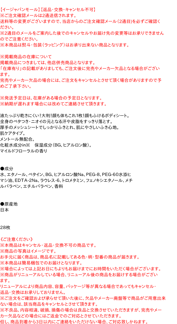 【イージャパンモール】【返品・交換・キャンセル不可】 ※ご注文確認メールは2通送信されます。 送料等の変更がございますので、当店からのご注文確認メール(2通目)を必ずご確認ください。 ※2通目のメールをご案内した後でのキャンセルやお届け先の変更等はお承りできませんのでご注意ください。 ※本商品は熨斗・包装(ラッピング)はお承り出来ない商品となります。※商品はご注文(ご決済)後、3-5営業日で発送(土・日・祝日除く)となります。※配送業者と契約がないため、送付先が北海道・沖縄・離島の場合キャンセルとさせていただきます。※掲載商品の在庫について 掲載商品につきましては、他店併売商品となります。 「在庫有り」の記載がありましても、ご注文後に完売やメーカー欠品となる場合がございます。 完売やメーカー欠品の場合には、ご注文をキャンセルとさせて頂く場合がありますので予めご了承下さい。 ※発送予定日は、在庫がある場合の予定日となります。 ※納期が遅れます場合には改めてご連絡させて頂きます。液たっぷり乾きにくい!大判!顔も体もこれ1枚!顔もふけるボディシート。 全身のベタつき・ニオイの元となる汗や皮脂をすっきり落とす。 厚手のメッシュシートでしっかりふきとれ、肌にやさしいふき心地。 肌ケアタイプ。 メントール無配合。 化粧水成分in※ 保湿成分(BG、ヒアルロン酸)。 マイルドフローラルの香り ●成分 水、エタノール、ベタイン、BG、ヒアルロン酸Na、PEG-8、PEG-60水添ヒマシ油、EDTA-2Na、ラウレス-6、トロメタミン、フェノキシエタノール、メチルパラベン、エチルパラベン、香料 ●原産地 日本 28枚【メーカー・製造または販売元】花王株式会社0120-165-692【広告文責】株式会社イージャパンアンドカンパニーズ 072-875-6666《ご注意ください》 ※本商品はキャンセル・返品・交換不可の商品です。 ※商品の写真はイメージです。 お手元に届く商品は、商品名に記載してある色・柄・型番の商品が届きます。 ※本商品は簡易梱包でのお届けとなります。 ※場合によっては上記お日にちよりもお届けまでにお時間をいただく場合がございます。 ※商品がリニューアルしている場合、リニューアル後の商品をお届けする場合がございます。 リニューアルにより商品内容、容量、パッケージ等が異なる場合であってもキャンセル・返品・交換はお承りしておりません。 ※ご注文をご確認および承らせて頂いた後に、欠品やメーカー廃盤等で商品がご用意出来ない場合は、該当商品をキャンセルとさせて頂きます。 ※不良品、内容相違、破損、損傷の場合は良品と交換させていただきますが、完売やメーカー欠品などの場合にはご返金でのご対応とさせていただきます。 但し、商品到着から3日以内にご連絡をいただけない場合、ご対応致しかねます。[関連キーワード:ボディケア ボディシート 化粧水 スキンケア 厚手 メッシュシート 大判]