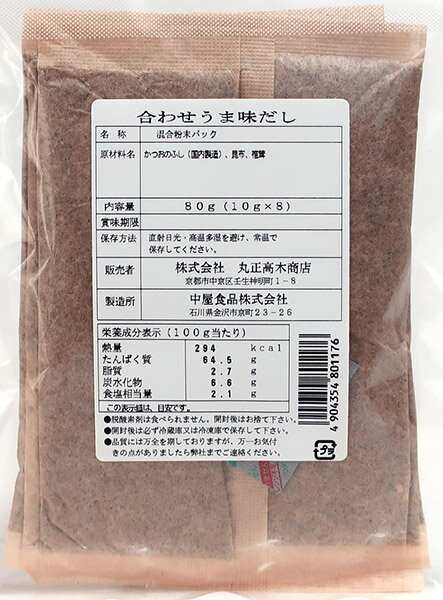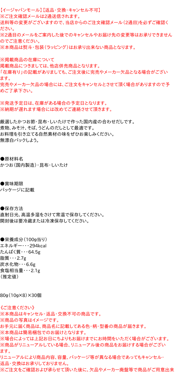 【イージャパンモール】【返品・交換・キャンセル不可】 ※ご注文確認メールは2通送信されます。 送料等の変更がございますので、当店からのご注文確認メール(2通目)を必ずご確認ください。 ※2通目のメールをご案内した後でのキャンセルやお届け先の変更等はお承りできませんのでご注意ください。 ※本商品は熨斗・包装(ラッピング)はお承り出来ない商品となります。※商品はご注文(ご決済)後、3-5営業日で発送(土・日・祝日除く)となります。※配送業者と契約がないため、送付先が北海道・沖縄・離島の場合キャンセルとさせていただきます。※掲載商品の在庫について 掲載商品につきましては、他店併売商品となります。 「在庫有り」の記載がありましても、ご注文後に完売やメーカー欠品となる場合がございます。 完売やメーカー欠品の場合には、ご注文をキャンセルとさせて頂く場合がありますので予めご了承下さい。 ※発送予定日は、在庫がある場合の予定日となります。 ※納期が遅れます場合には改めてご連絡させて頂きます。厳選したかつお節・昆布・しいたけで作った国内産の合わせだしです。 煮物、みそ汁、そば、うどんのだしとして最適です。 お料理を引き立てる自然素材の味をぜひお楽しみください。 無漂白パックしよう。 ●原材料名 かつお(国内製造)・昆布・しいたけ ●賞味期限 パッケージに記載 ●保存方法 直射日光、高温多湿をさけて常温で保存してください。 開封後は要冷蔵または冷凍保存してください。 ●栄養成分(100g当り) エネルギー・・・294kcal たんぱく質・・・64.5g 脂質・・・2.7g 炭水化物・・・6.6g 食塩相当量・・・2.1g (推定値) 80g(10g×8)×30個【メーカー・製造または販売元】株式会社丸正高木商店075-801-0001【広告文責】株式会社イージャパンアンドカンパニーズ 072-875-6666《ご注意ください》 ※本商品はキャンセル・返品・交換不可の商品です。 ※商品の写真はイメージです。 お手元に届く商品は、商品名に記載してある色・柄・型番の商品が届きます。 ※本商品は簡易梱包でのお届けとなります。 ※場合によっては上記お日にちよりもお届けまでにお時間をいただく場合がございます。 ※商品がリニューアルしている場合、リニューアル後の商品をお届けする場合がございます。 リニューアルにより商品内容、容量、パッケージ等が異なる場合であってもキャンセル・返品・交換はお承りしておりません。 ※ご注文をご確認および承らせて頂いた後に、欠品やメーカー廃盤等で商品がご用意出来ない場合は、該当商品をキャンセルとさせて頂きます。 ※不良品、内容相違、破損、損傷の場合は良品と交換させていただきますが、完売やメーカー欠品などの場合にはご返金でのご対応とさせていただきます。 但し、商品到着から3日以内にご連絡をいただけない場合、ご対応致しかねます。[関連キーワード:調味料 ダシ 出汁 ダシパック 粉末パック 鰹節 昆布 しいたけ 汁物 煮物 麺類 和食]