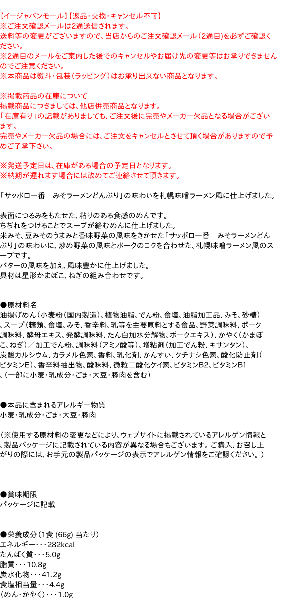 【イージャパンモール】【返品・交換・キャンセル不可】 ※ご注文確認メールは2通送信されます。 送料等の変更がございますので、当店からのご注文確認メール(2通目)を必ずご確認ください。 ※2通目のメールをご案内した後でのキャンセルやお届け先の変更等はお承りできませんのでご注意ください。 ※本商品は熨斗・包装(ラッピング)はお承り出来ない商品となります。※商品はご注文(ご決済)後、3-5営業日で発送(土・日・祝日除く)となります。※配送業者と契約がないため、送付先が北海道・沖縄・離島の場合キャンセルとさせていただきます。※送付先が東北の場合別途300円の送料を加算させていただきます。※掲載商品の在庫について 掲載商品につきましては、他店併売商品となります。 「在庫有り」の記載がありましても、ご注文後に完売やメーカー欠品となる場合がございます。 完売やメーカー欠品の場合には、ご注文をキャンセルとさせて頂く場合がありますので予めご了承下さい。 ※発送予定日は、在庫がある場合の予定日となります。 ※納期が遅れます場合には改めてご連絡させて頂きます。「サッポロ一番 みそラーメンどんぶり」の味わいを札幌味噌ラーメン風に仕上げました。 表面につるみをもたせた、粘りのある食感のめんです。 ちぢれをつけることでスープが絡むめんに仕上げました。 米みそ、豆みそのうまみと香味野菜の風味をきかせた「サッポロ一番 みそラーメンどんぶり」の味わいに、炒め野菜の風味とポークのコクを合わせた、札幌味噌ラーメン風のスープです。 バターの風味を加え、風味豊かに仕上げました。 具材は星形かまぼこ、ねぎの組み合わせです。 ●原材料名 油揚げめん(小麦粉(国内製造)、植物油脂、でん粉、食塩、油脂加工品、みそ、砂糖)、スープ(糖類、食塩、みそ、香辛料、乳等を主要原料とする食品、野菜調味料、ポーク調味料、酵母エキス、発酵調味料、たん白加水分解物、ポークエキス)、かやく(かまぼこ、ねぎ)/加工でん粉、調味料(アミノ酸等)、増粘剤(加工でん粉、キサンタン)、炭酸カルシウム、カラメル色素、香料、乳化剤、かんすい、クチナシ色素、酸化防止剤(ビタミンE)、香辛料抽出物、酸味料、微粒二酸化ケイ素、ビタミンB2、ビタミンB1、(一部に小麦・乳成分・ごま・大豆・豚肉を含む) ●本品に含まれるアレルギー物質 小麦・乳成分・ごま・大豆・豚肉 (※使用する原材料の変更などにより、ウェブサイトに掲載されているアレルゲン情報と、製品パッケージに記載されている内容が異なる場合もございます。 ご購入、お召し上がりの際には、お手元の製品パッケージの表示でアレルゲン情報をご確認ください。 ) ●賞味期限 パッケージに記載 ●栄養成分(1食 (66g) 当たり) エネルギー・・・282kcal たんぱく質・・・5.0g 脂質・・・10.8g 炭水化物・・・41.2g 食塩相当量・・・4.4g (めん・かやく)・・・1.0g (スープ)・・・3.4g ビタミンB1・・・0.32mg ビタミンB2・・・0.31mg カルシウム・・・114mg 66g×12個【メーカー・製造または販売元】サンヨー食品株式会社0120-028-384【広告文責】株式会社イージャパンアンドカンパニーズ 072-875-6666《ご注意ください》 ※本商品はキャンセル・返品・交換不可の商品です。 ※商品の写真はイメージです。 お手元に届く商品は、商品名に記載してある色・柄・型番の商品が届きます。 ※本商品は簡易梱包でのお届けとなります。 ※場合によっては上記お日にちよりもお届けまでにお時間をいただく場合がございます。 ※商品がリニューアルしている場合、リニューアル後の商品をお届けする場合がございます。 リニューアルにより商品内容、容量、パッケージ等が異なる場合であってもキャンセル・返品・交換はお承りしておりません。 ※ご注文をご確認および承らせて頂いた後に、欠品やメーカー廃盤等で商品がご用意出来ない場合は、該当商品をキャンセルとさせて頂きます。 ※不良品、内容相違、破損、損傷の場合は良品と交換させていただきますが、完売やメーカー欠品などの場合にはご返金でのご対応とさせていただきます。 但し、商品到着から3日以内にご連絡をいただけない場合、ご対応致しかねます。[関連キーワード:食品 カップ麺 インスタント 即席 らーめん ラーメン 麺 ヌードル 味噌味]