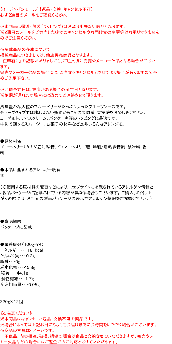 【イージャパンモール】【返品・交換・キャンセル不可】 必ず2通目のメールをご確認ください。 ※本商品は熨斗・包装(ラッピング)はお承り出来ない商品となります。 ※2通目のメールをご案内した後でのキャンセルやお届け先の変更等はお承りできませんのでご注意ください。※商品はご注文(ご決済)後、3-5営業日で発送(土・日・祝日除く)となります。※配送業者と契約がないため、送付先が北海道・沖縄・離島の場合キャンセルとさせていただきます。※掲載商品の在庫について 掲載商品につきましては、他店併売商品となります。 「在庫有り」の記載がありましても、ご注文後に完売やメーカー欠品となる場合がございます。 完売やメーカー欠品の場合には、ご注文をキャンセルとさせて頂く場合がありますので予めご了承下さい。 ※発送予定日は、在庫がある場合の予定日となります。 ※納期が遅れます場合には改めてご連絡させて頂きます。風味豊かな大粒のブルーベリーがたっぷり入ったフルーツソースです。 チューブタイプでは味わえない瓶だからこその果肉感、果実感をお楽しみください。 ヨーグルト、アイスクリーム、パンケーキ等のトッピングに最適です。 牛乳で割ってスムージー、お菓子の材料など是非いろんなアレンジを。 ●原材料名 ブルーベリー(カナダ産)、砂糖、イソマルトオリゴ糖、洋酒/増粘多糖類、酸味料、香料 ●本品に含まれるアレルギー物質 無し (※使用する原材料の変更などにより、ウェブサイトに掲載されているアレルゲン情報と、製品パッケージに記載されている内容が異なる場合もございます。 ご購入、お召し上がりの際には、お手元の製品パッケージの表示でアレルゲン情報をご確認ください。 ) ●賞味期限 パッケージに記載 ●栄養成分(100g当り) エネルギー・・・181kcal たんぱく質・・・0.2g 脂質・・・0g 炭水化物・・・45.8g 糖質・・・44.1g 食物繊維・・・1.7g 食塩相当量・・・0.05g 320g×12個【メーカー・製造または販売元】和歌山産業株式会社0237-47-0441【広告文責】株式会社イージャパンアンドカンパニーズ 072-875-6666《ご注意ください》 ※本商品はキャンセル・返品・交換不可の商品です。 ※場合によっては上記お日にちよりもお届けまでにお時間をいただく場合がございます。 ※商品の写真はイメージです。 不良品、内容相違、破損、損傷の場合は良品と交換させていただきますが、完売やメーカー欠品などの場合にはご返金でのご対応とさせていただきます。 但し、商品到着から3日以内にご連絡をいただけない場合、ご対応致しかねます。 ※本商品は熨斗・包装(ラッピング)はお承り出来ない商品となります。 ※商品がリニューアルしている場合、リニューアル後の商品にてお届けとなる場合がございます。 リニューアルにより商品内容、容量、パッケージ等が異なる場合であってもキャンセル・返品・交換はお承りしておりません。 ※ご注文後、完売やメーカー欠品等の場合には該当商品をキャンセルとさせていただく場合がありますので予めご了承ください。[関連キーワード:食品 瓶詰 フルーツソース ジャム トッピング 製菓材料]