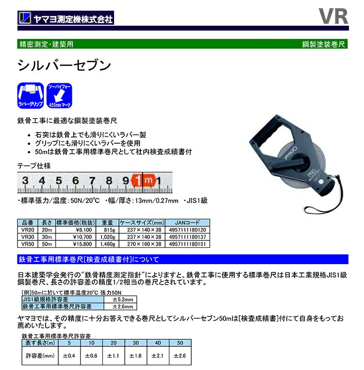 メーカー分類:ヤマヨ【オススメ】〈ヤマヨ〉 シルバーセブン 50m VR50 ヤマヨ測定機 シルバーセブン 50m VR50 《仕様》 図表にて、品番でご確認ください。(※図表は、メーカー公表の物を流用しております。当店にて取扱いの無い品も、含まれる場合がございます。) 【在庫がある場合】在庫があれば価格下の出荷予定に従い発送します。(カラー・サイズ等の商品リストがある場合、カラー・サイズ・タイプ等により出荷予定が異なることがありますので、ご注意ください。) ※当店では別サイトでも販売を行っております。サイト上では在庫有りの表示がありましても、 稀に在庫切れの場合もございます。その様な場合は、何卒ご容赦ください。(別途メール等にて、ご連絡させていただきます。) 1