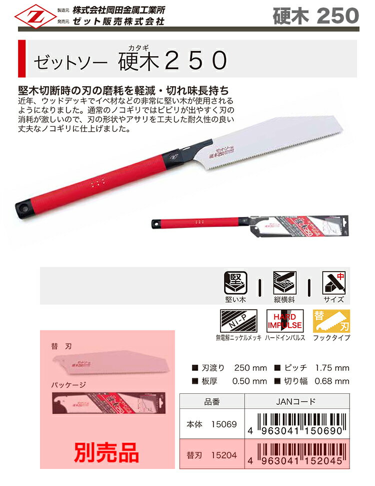 メーカー分類:ゼットソー/岡田金属工業所【オススメ】 〈ゼット〉 ゼットソー 硬木 250 本体 15069 岡田金属工業所/ゼットソー ゼットソー 硬木 250 本体 15069 《仕様》 図表にて、品番でご確認ください。(※図表は、メーカー公表の物を流用しております。当店にて取扱いの無い品も、含まれる場合がございます。) 【在庫がある場合】在庫があれば価格下の出荷予定に従い発送します。(カラー・サイズ等の商品リストがある場合、カラー・サイズ・タイプ等により出荷予定が異なることがありますので、ご注意ください。) ※当店では別サイトでも販売を行っております。サイト上では在庫有りの表示がありましても、 稀に在庫切れの場合もございます。その様な場合は、何卒ご容赦ください。(別途メール等にて、ご連絡させていただきます。) 1
