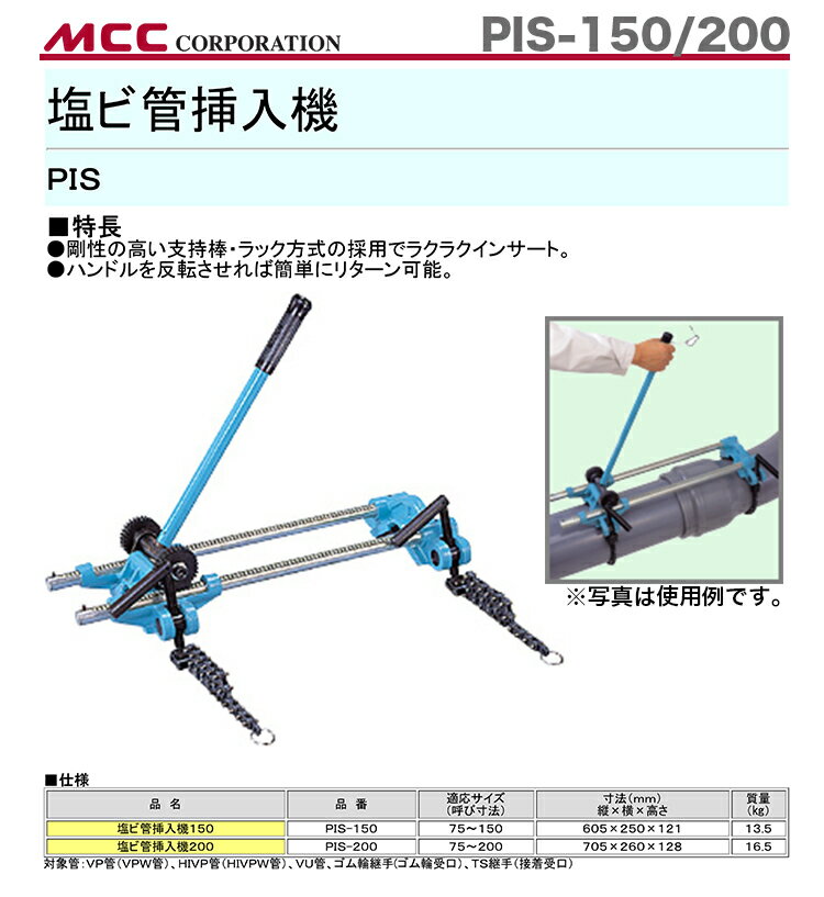 メーカー分類:エムシーシー/MCC【オススメ】【新着商品】〈MCC〉塩ビ管挿入機 PIS-200 松阪鉄工所 塩ビ管挿入機 PIS-200 《仕様》 図表にて、『品名・品番・規格(サイズ)』よりご確認ください。(※図表は、メーカー公表の物を流用しております。当店にて取扱いの無い品も、含まれる場合もございます。) 【在庫がある場合】在庫があれば価格下の出荷予定に従い発送します。(カラー・サイズ等の商品リストがある場合、カラー・サイズ・タイプ等により出荷予定が異なることがありますので、ご注意ください。) ※当店では別サイトでも販売を行っております。サイト上では在庫有りの表示がありましても、 稀に在庫切れの場合もございます。その様な場合は、何卒ご容赦ください。(別途メール等にて、ご連絡させていただきます。) 1