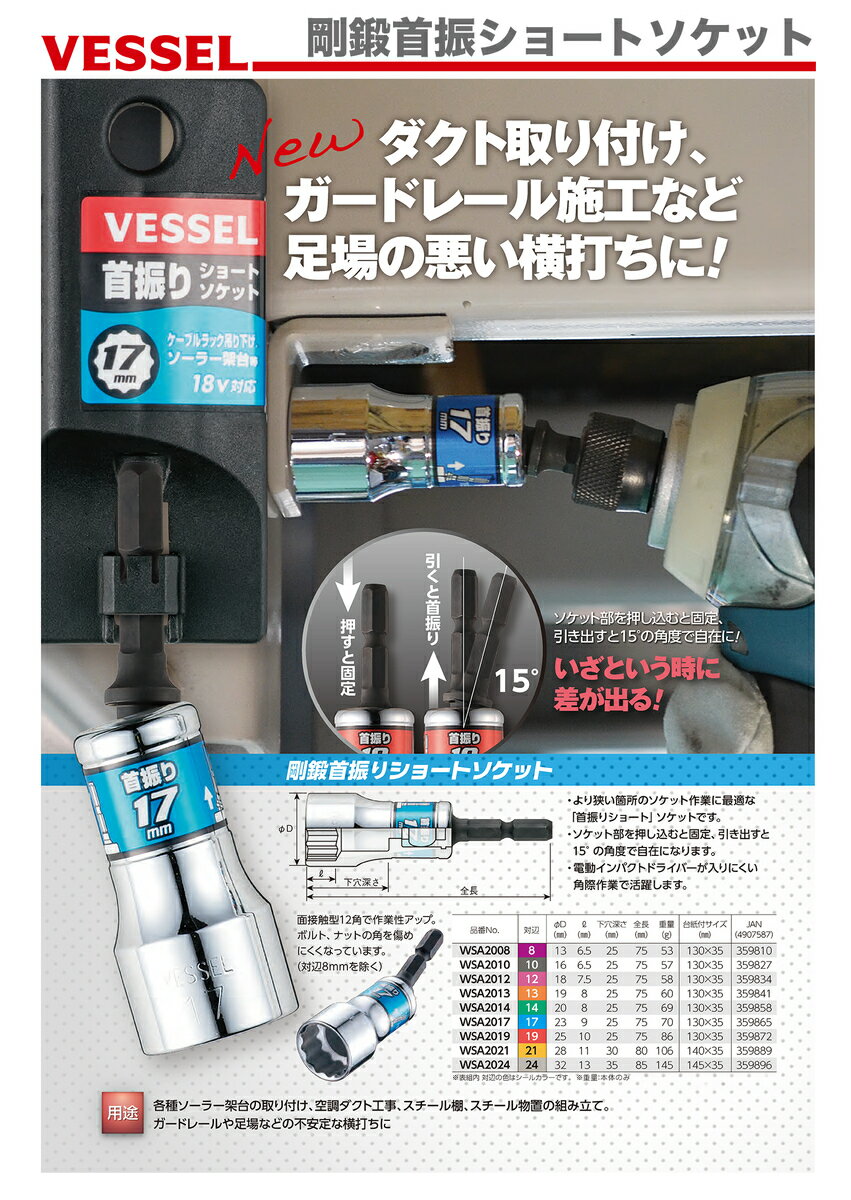 メーカー分類:ベッセル【オススメ】〈ベッセル〉剛鍛首振ショートソケット WSA2010 VESSEL 剛鍛首振ショートソケット WSA2010 《仕様》 図表にて、『品名・品番・サイズ・JANコード』等よりご確認ください。(※図表は、メーカー公表の物を流用しております。当店にて取扱いの無い品も、含まれる場合がございます。) 【在庫がある場合】2〜3営業日以内に発送します。※当店では別サイトでも販売を行っております。サイト上では在庫有りの表示がありましても、 稀に在庫切れの場合もございます。その様な場合は、何卒ご容赦ください。(別途メール等にて、ご連絡させていただきます。) 1