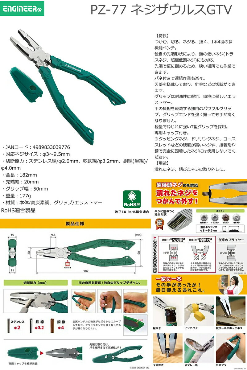 メーカー分類:エンジニア/ENGINEER【オススメ】〈エンジニア〉ネジザウルスGTV PZ-77 ENGINEER ネジザウルスGTV PZ-77 潰れたネジ、錆びたネジの取り外しに 頭の低いネジ(トラスネジ・超極低頭ネジ)にも対応。 《仕様》 図表にて、『品番』よりご確認ください。(※図表は、メーカー公表の物を流用しております。当店にて取扱いの無い品も、含まれる場合がございます。) 【在庫がある場合】在庫があれば価格下の出荷予定に従い発送します。(カラー・サイズ等の商品リストがある場合、カラー・サイズ・タイプ等により出荷予定が異なることがありますので、ご注意ください。) ※当店では別サイトでも販売を行っております。サイト上では在庫有りの表示がありましても、 稀に在庫切れの場合もございます。その様な場合は、何卒ご容赦ください。(別途メール等にて、ご連絡させていただきます。) 1