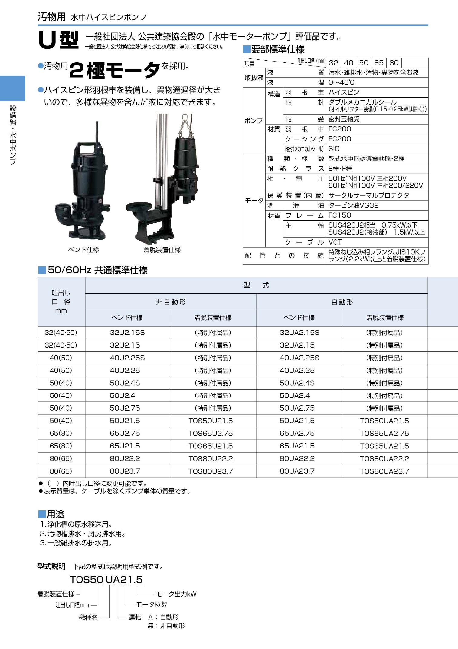 〈ツルミ〉50U2.75 50Hz 東日本用 雑排水用 水中ハイスピンポンプ U型 非自動形 口径50mm 三相200V 出力0.75kW ツルミポンプ 代引不可