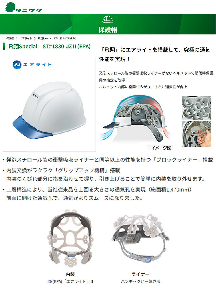 【オススメ】〈タニザワ〉 保護帽(ヘルメット) 飛翔Special ST#1830-JZ ll (EPA) 谷沢製作所 保護帽(ヘルメット)〔エアライト〕 飛翔Special ST#1830-JZ2(EPA) 《仕様》 図表にて、『品番』よりご確認ください。(※図表は、メーカー公表の物を流用しております。当店にて取扱いの無い品も、含まれる場合がございます。) 【在庫がある場合】価格下の出荷予定に従い発送します1