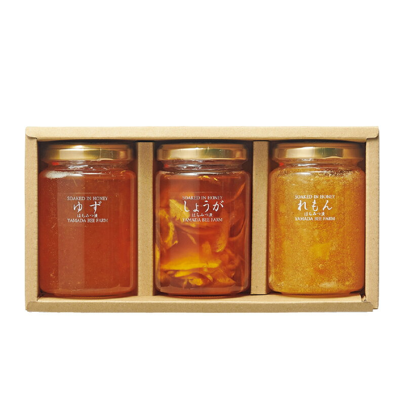 国産果実やしょうがをたっぷりのはちみつで漬けこんだ、はちみつ漬3種の詰合せ。お湯で割ったり、パンやヨーグルトに加えたり、お好みのスタイルでお召し上がりください。【商品提供者コメント】 ●名称/しょうが・はちみつづけ、ゆず・はちみつづけ、レモン・はちみつづけ ●商品内容/しょうがはちみつ漬・ゆずはちみつ漬・れもんはちみつ漬 各200g ●原料原産地/はちみつ=ルーマニア産又はメキシコ産又はカナダ産他 ●賞味期間/常温で1年 ●原材料/・しょうがはちみつ漬け はちみつ(ルーマニア産又はメキシコ産又はその他)、生姜 ・ゆずはちみつ漬け はちみつ(カナダ産又はルーマニア産又はその他)、ゆず果皮、ゆず果汁/増粘剤(ペクチン)、ビタミンC ・レモンはちみつ漬け はちみつ(カナダ産又はルーマニア産又はその他)、レモン果皮、レモン果汁/酸味料、ゲル化剤(ペクチン)、ビタミンC ●保存方法/直射日光や高温多湿を避け、涼しい所で保存してください。 ●製造者名(加工業者名)/株式会社山田養蜂場(岡山県苫田郡鏡野町市場194) 【キャンセルについて】 ●お申し込み後のキャンセルは、受け付けておりません。あらかじめご了承ください。 【商品のお届けについて】 ●こちらの商品は1週間〜10日程度でお届けいたします。 お歳暮のしをご選択された場合は12月上旬以降順次でお届けします。 ※お届け期間が限られた一部の商品は、「御歳暮のし」をご指定いただいても、上記期間以外にお届けする場合がございますので、予めご了承ください。 ※天候や育成状況により、予定の時期よりもお届けが前後することがございます。その際は、早着、遅延のご案内、代替商品又はキャンセル等のご案内をさせていただく場合がございます。 また、注文状況によりお届けに日数がかかることがございます。あらかじめご了承ください。 【配送について】 ●こちらの商品は常温便でのお届けとなります。あらかじめご了承下さい。 ※土日・祝日(大型連休)を挟む場合や天候・農産物の生育状況によってはお届けが遅れる場合がございます。 なお、お受け取り頂けない商品につきましては、再発送、ご返金、ポイントの返却は致しか ねます。予めご了承下さい。 また、消費・賞味期間5日以内の商品をお申し込みの場合は、お届けが消費・賞味期間最終日になることがありますのでご了承下さい。 【のし・包装について】 ●商品によっては「短冊のし」や「簡易のしシール」でお届けの場合がございます。 ※ご自宅用など一部の商品は、のし紙は付きません。 【冷凍品のご注意】 ●冷凍品については佐川急便の飛脚クール便(冷凍)でお届けします。 ※一部時間帯指定不可の地域があります。 ※島しょ及び山間部の一部地域へのお届けについては、受付ができませんのでご了承ください。 ----【その他のご注意】---- ※商品画像はイメージです。「商品内容」として記載されていないものや「小道具類」はお届けする商品に含まれておりませんので、商品内容をお確かめの上、お申込みください。 ※島しょ(東京都・鹿児島県・沖縄県)の一部へのお届けについては、生もの(消費・賞味期間5日以内)・生鮮品(果物・野菜・活魚介類)の一部・冷凍品・生花(セット商品を含む)は受付ができませんのでご了承ください。 ※消費・賞味期間5日以内の商品をお申込みの場合は、お届けが消費・賞味期限の最終日になることがありますのでご了承ください。 ※青果物のサイズ指定はできません。天候によりお届け期間が変更になる場合がございます。 ※「消費期間」は製造(加工)日から安全に召し上がれる日まで、「賞味期間」は品質の保持が十分に可能な日までをそれぞれ期間で表示しています。 お届け日からの期間を保証するものではありません。複数の商品がセットになっている場合、最も短い期間を表示しています。 なお、法律に基づく賞味(消費)期限については、各お届け商品に記載しています。 ※花卉・花弁の開花状態及び花色、リボン、ラッピング(包装)等は多少異なる場合があります。 ※商品の箱やパッケージデザインが変更になる場合があります。 ※挨拶状は同封することができませんのでご了承ください。 ※複数商品の一括送付及び同時発送はできません。 また、ご依頼主様とお届け先様が同じ場合、同日のお申込みであっても商品によりお届け日が異なる場合がございますので、あらかじめご了承ください。 【季節の贈り物に】 お年賀 迎春 お正月 年末年始 バレンタイン ホワイトデー 卒業式 卒園式 入学式 入園式 母の日 父の日 御中元 お中元 暑中御見舞 残暑御見舞 敬老の日 ハロウィン クリスマス 冬ギフト お歳暮 御歳暮 【ちょっとした手土産・プレゼントに】 御祝 御礼 謝礼 御挨拶 粗品 お使い物 贈答品 ギフト プレゼント お土産 手土産 贈りもの 進物 お返し 【お祝い・お返しの品に】 引き出物 お祝い 内祝 結婚祝 結婚内祝 出産祝 出産内祝 引き菓子 快気祝 快気内祝 プチギフト 結婚引出物 七五三 