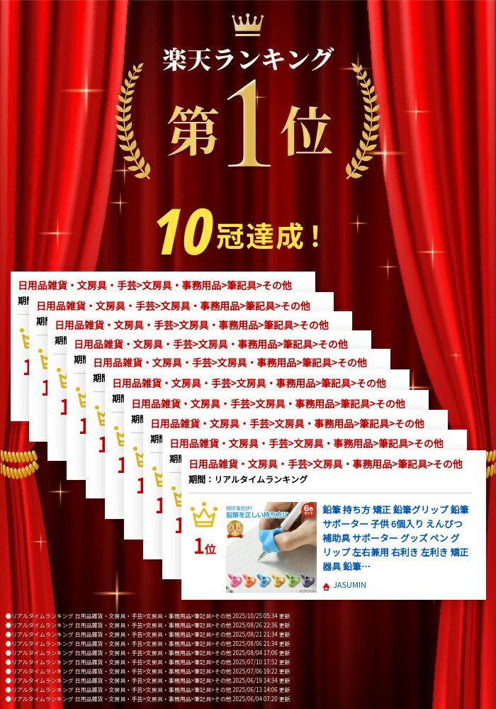 関連ワード: ペングリップ 鉛筆 持ち方 矯正 鉛筆持ち方グリップ 鉛筆矯正グリップ 鉛筆ホルダー 幼児 子供 小学生 小学校 幼稚園 孫 入学 低学年 鉛筆持ち方左利き 鉛筆持ち方矯正大人 鉛筆矯正器具 男の子 女の子 男子 女子 ギフト プレゼント お祝い 入学祝い 受験 おすすめ シーン: 幼児 子供 幼稚園 小学校 入学 受験 お祝い 男の子 女の子 プレゼント ギフト カラー: ブルー ピンク イエロー パープル グリーン 青色 桃色 黄色 紫色 緑色 マルチカラー 【簡単装着】 真ん中の穴に鉛筆を差し込んで固定し、親指と人差指で挟み中指を穴へ通すだけの簡単装着。 違和感なく自然と正しい角度で鉛筆を持てるようになります。 【こんな方にオススメ】 初めて鉛筆を使うお子さま、ペンの持ち方や姿勢が気になるお子さま、字を綺麗に書きたい大人の方にもオススメです。 右利き左利きどちらでも使えます。 【幅広い筆記具に対応】 鉛筆軸の形状が三角軸、六角軸、丸軸タイプはもちろん、ボールペンやシャープペンにも対応可能です。 学校やご自宅での勉強、習い事や塾にもおすすめです。 【プレゼントに最適】 鉛筆の正しい持ち方を習得したいお子さまや初めて鉛筆を使うお子さまへのプレゼントにぴったり! 誤った持ち方でクセが付く前に簡単に習得できます。 【素材】ソフトシリコン 【サイズ】33mm×39mm×34mm ※6個入り。カラーはランダムになりますので選べません。 ※モニターの発色具合によって実際の物と色が異なる場合がございます。 ※JASDESIGNは当店が商標登録しているブランドです。