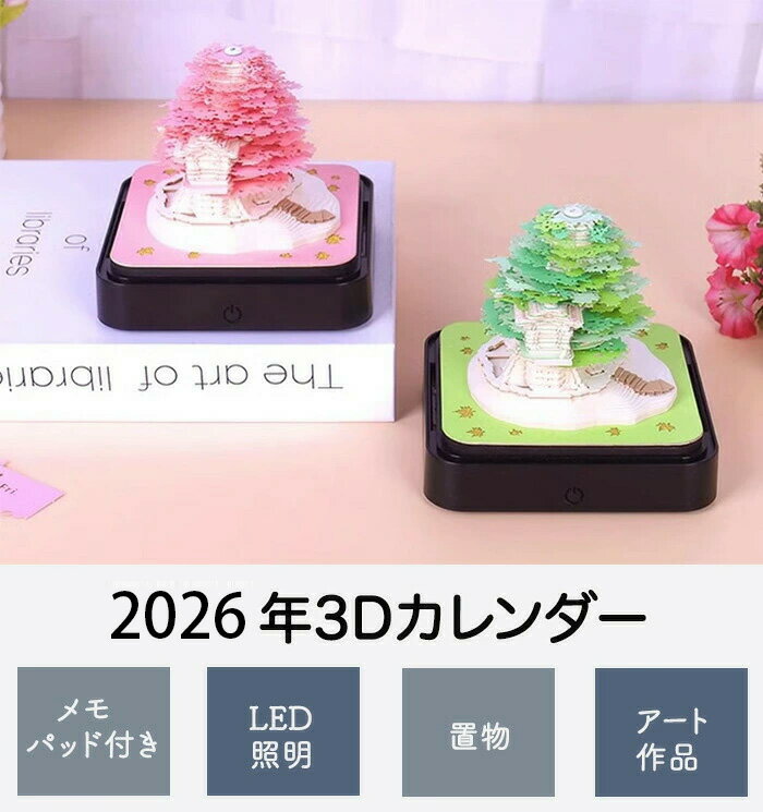 メーカー希望小売価格はメーカーカタログに基づいて掲載しています商品情報【サイズ・素材・カラー】サイズ:サイズ表記は画像ご確認下さい。素材:紙・PVCカラー:ピンク・ツリー/グリーン・ツリー/ブルー・地球/レッド・地球/レッド・キノコ/ピンク・キノコ/グリーン・キノコ/ブルー・キノコ商品内容:商品本体のみ【ご注意】単四電池×2本が必要です。(電池は付属しておりません)【おしゃれなメモパッド付きカレンダー】おしゃれなカレンダーメモパッド!カレンダーが立体作品に!【おしゃれな立体作品に!】おしゃれな立体作品になるのを見るのが楽しめ毎日めくるのがワクワクするカレンダーメモパッドです。【LEDライト付き】LEDライト付きだから作品ができた後照らすとおしゃれで幻想的な空間になること間違いなし!購入前のご注意※商品写真はできる限り実物と近づけるようにしておりますが、お使いのモニター設定、お部屋の照明等により実際の商品と色味が異なる場合がございます。※採寸はあくまで目安としてのもので、表記に多少の誤差(前後2?3cm)が生じる場合があります。※生産時期により、色・サイズ・デザインが多少が異なる場合がございますので、複数の商品をご注文頂いた場合も多少に異なる場合があります。※当店の商品は全て日本人スタッフにより検品してから発送したものです。海外からの輸入商品のため、縫製は日本製のものと比べて、 縫製の見劣、糸のほつれ、製造過程における小さなキズ、シミなどがある場合がございますが、不良品ではございません。予めご了承くださいませ。※各商品は各商品ページ選択肢のところに規定ある納期より発送いたします。当店では複数店舗で在庫を共有しており、システムによる在庫調整を行っております。ご注文が集中した場合、タイミングにより在庫にずれが生じ欠品となる可能性がございます。 その際、当店での注文確認後にご案内させていただく場合がございますこと、予めご了承ください。商品の保証初期不良の場合、未使用の商品のみ到着日から7日以内にご連絡いただければご返金、交換対応させていただきます。ご使用後の返金・交換は保証外となっております。2026年カレンダー カレンダー 3D メモパッド メモ付き おしゃれ 卓上 卓上カレンダー カレンダーメモパッド 3Dカレンダーメモパッド 付箋 立体感のある作品 ペーパーアート 立体カレンダー デスクカレンダー ノート 立体メモ帳 紙彫刻 立体作品 LEDライト LED照明2026年カレンダー カレンダー 3D メモパッド メモ付き おしゃれ 卓上 卓上カレンダー カレンダーメモパッド 3Dカレンダーメモパッド 付箋 立体感のある作品 ペーパーアート 立体カレンダー デスクカレンダー ノート 立体メモ帳 紙彫刻 立体作品 LEDライト LED照明 2026年カレンダーメモパッドメモ付き立体作品紙アートLEDライト紙彫刻3Dカレンダーメモパッドメモ帳卓上カレンダー