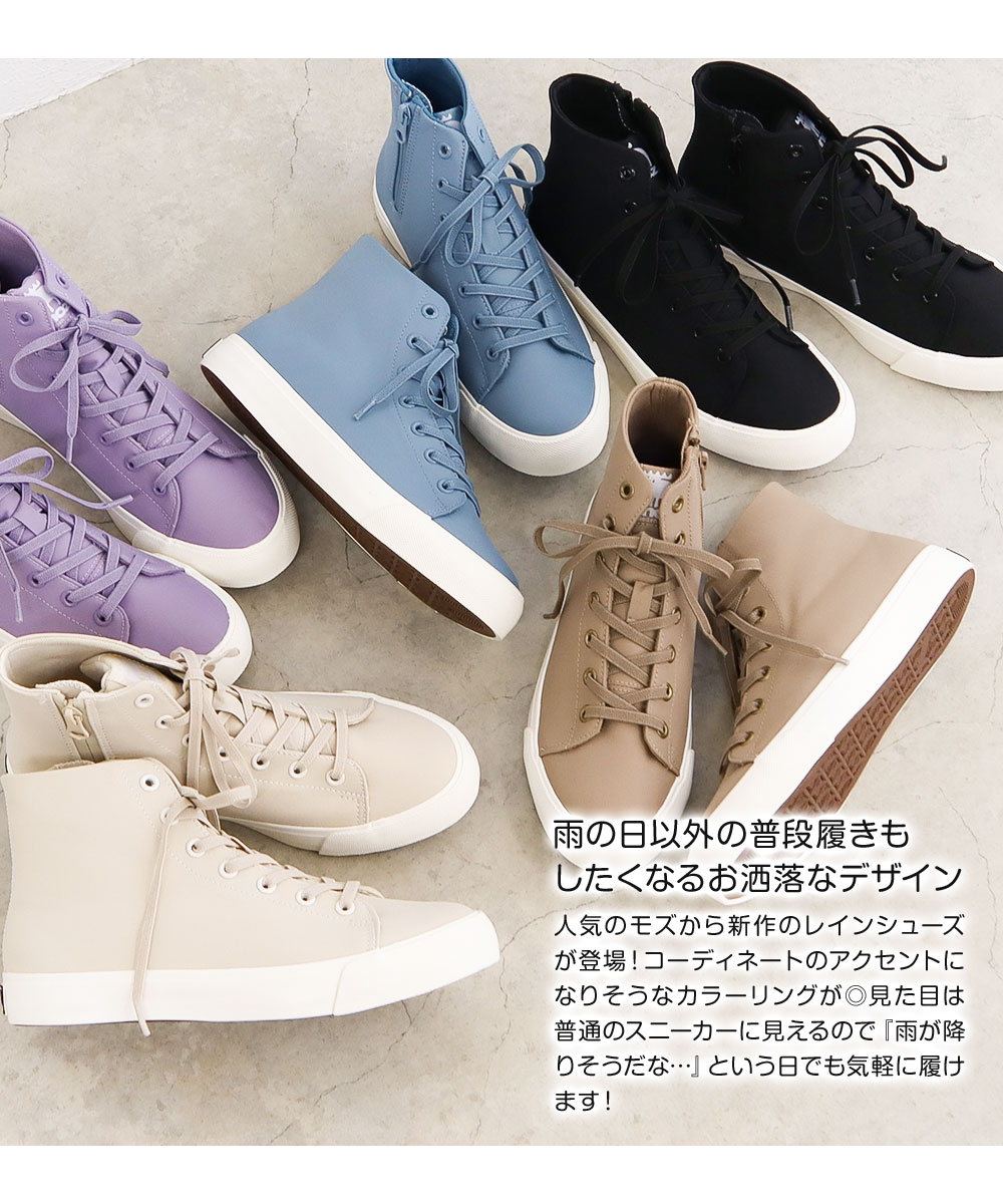 モズ moz レインシューズ スニーカー 防水 ハイカット レインシューズ レディース おしゃれ レインスニーカー サイドファスナー 蒸れにくい 履きやすい 歩きやすい 雨靴 女性 ブランド 黒 白 ブルー パープル ブラウン カーキ グレー 6002
