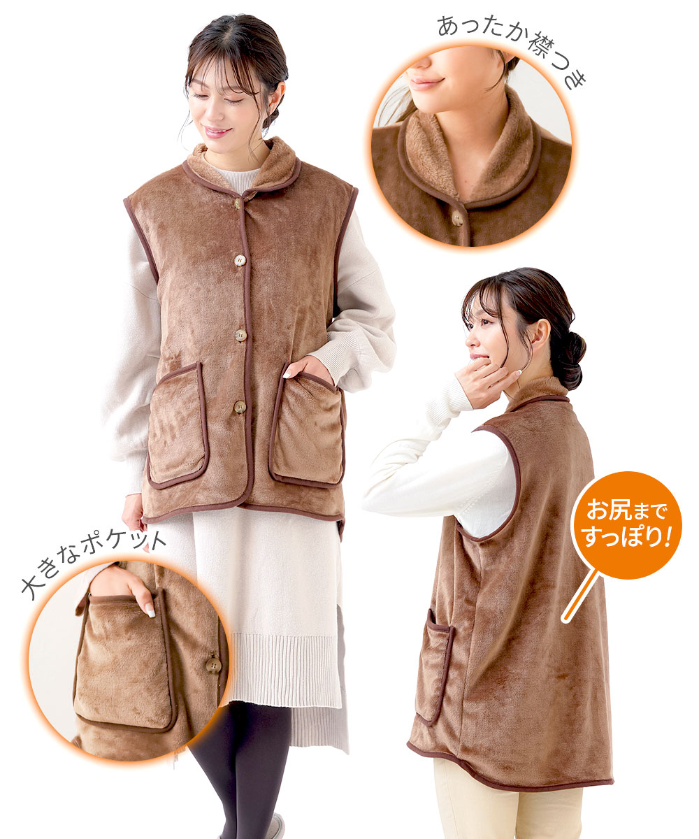 着る毛布 レディース パジャマ 部屋着 吸湿発熱 ポケット付き 首元 首周り 肩口 背中 お尻 温め 手触り とろみ 洗える 冬 暖かい 寝る時 睡眠時 家事 リラックスタイム 隙間風 冷え 肩こり 防寒 対策 安眠 グッズ ブラウン ホットアルファ HOTαあったかくつろぎベスト 235