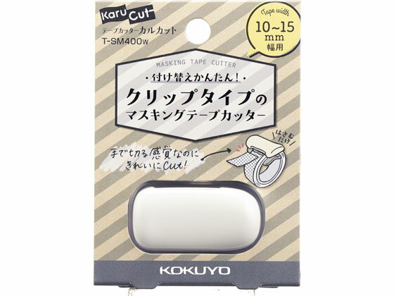 【仕様】はさむだけでテープにセットできるので、これひとつで、複数のマスキングテープが使えます。特殊加工をしたカルカット刃なので、切ったマスキングテープの切り口はギザギザにならずまっすぐキレイです。特殊加工刃はケガをしにくい設計です。●カラー:ホワイト●外寸法:幅40×奥行20×高さ20mm●対応テープ:幅10〜15mm/小巻き用●材質:本体/R−ABS・R−POM、刃/ステンレス※内径30mm未満や長さ10mを超えるテープには使用できない場合がありますのでご注意ください。※テープは付属しておりません。※テープの種類によっては切れにくい場合があります。【備考】※メーカーの都合により、パッケージ・仕様等は予告なく変更になる場合がございます。【検索用キーワード】こくよ KOKUYO かるかっとくりっぷたいぷ KaruCutclipType かるカット てーぷかったー マスキングテープカッター せろはんてーぷ台 セロハンテープ台 セロテープ台 マスキングテープ用 小型テープ専用 幅10〜15mm 白 シロ しろ T−SM400W TSM400W 1個 文房具 小学校文具 こども文具 貼る留める用品 接着テープ X77316はさむだけで、付け替えかんたん!クリップタイプのマスキングテープカッター