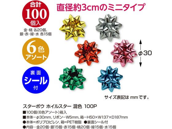【商品説明】キラッと輝くメタリックカラーです。キラッと輝くメタリック金・銀・赤・桃・緑・紺の6色セットです。直径約3cmのミニタイプ。業務用100個仕立て。【仕様】●入数:100個(6色アソート)箱入●サイズ:本体/直径30mm、リボン/幅5mm、箱/高さ50mm×幅137mm×奥行187mm●裏面シール付●アソート内容:金20個・銀15個・赤15個・桃20個・緑15個・紺15個【備考】※メーカーの都合により、パッケージ・仕様等は予告なく変更になる場合がございます。【検索用キーワード】ササガワ ささがわ SASAGAWA タカ印 たかじるし タカジルシ TAKAJIRUSHI スターボウ ホイルスター 混色 100P スターボウホイルスター混色100P すたーぼう ほいるすたー こんしょく 100P 店舗用品 ラッピング用品 包装用品 リボン リボン包装用 ギフト用品 シール付き 100個 6色アソート 箱入 直径30mm 金20個 銀15個 赤15個 桃20個 緑15個 紺15個 きん ぎん あか もも みどり こん キン ギン アカ モモ ミドリ コン 35−6768 356768 ラッピング 1箱 100個 包装紙・包装用品 リボン XZ7444裏面シール付き!ワンタッチで取付けが簡単なリボンです!