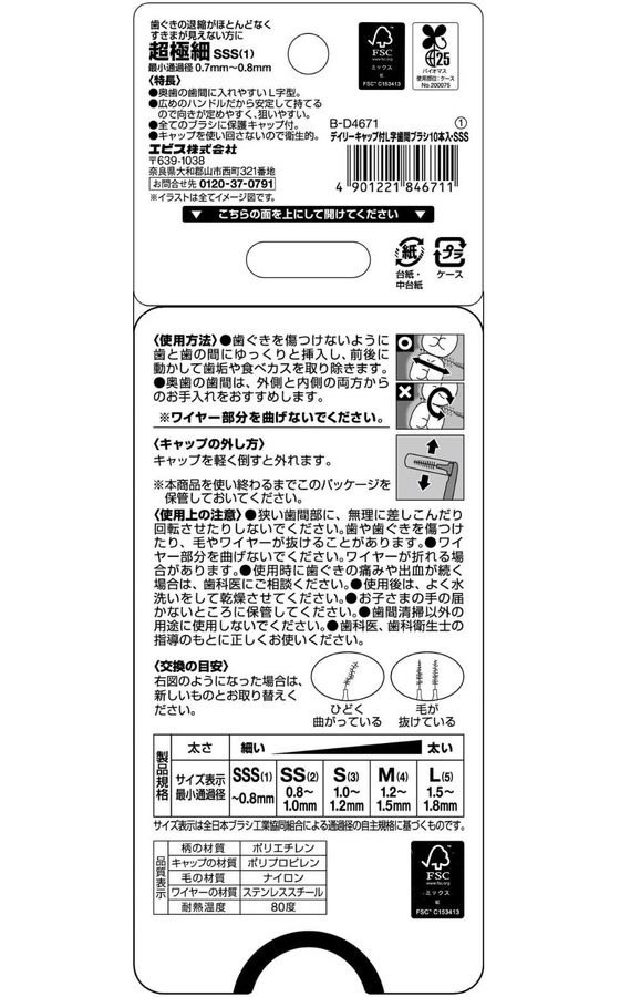 【商品説明】お手入れしにくい奥歯の歯間に入れやすいL字型歯間ブラシ。全てのブラシに保護キャップ付で衛生的かつ携帯に便利。キャップを使い回さないので衛生的。初心者でも安定して持てる広めのハンドルで向きが定めやすく、狙いやすい。歯ぐきの退縮がほとんどなくすきまが見えない方へ超極細(SSS)サイズ。【仕様】●入数:10本●SSSサイズ【備考】※メーカーの都合により、パッケージ・仕様等は予告なく変更になる場合がございます。【検索用キーワード】デイリーキャップ付L字歯間ブラシSSS10本 エビス えびす ebisu−grp オーラルケア デンタル用品 歯みがき 歯間ブラシ B−D4671デイリーキャップ付L字歯間ブラシSSS10本入 B−D4671 デイリーキャップ付 L字歯間ブラシ SSS 歯間ブラシ L字 キャップ付 BD4671 3Sサイズ 歯間の歯垢 歯間 歯垢除去 超極細 SSSサイズ 奥歯 保護キャップ付 で衛生的 携帯 1パック 10本 オーラルケア オーラルケアグッズ X227NGハブラシでは取りにくい歯間の歯垢を除去
