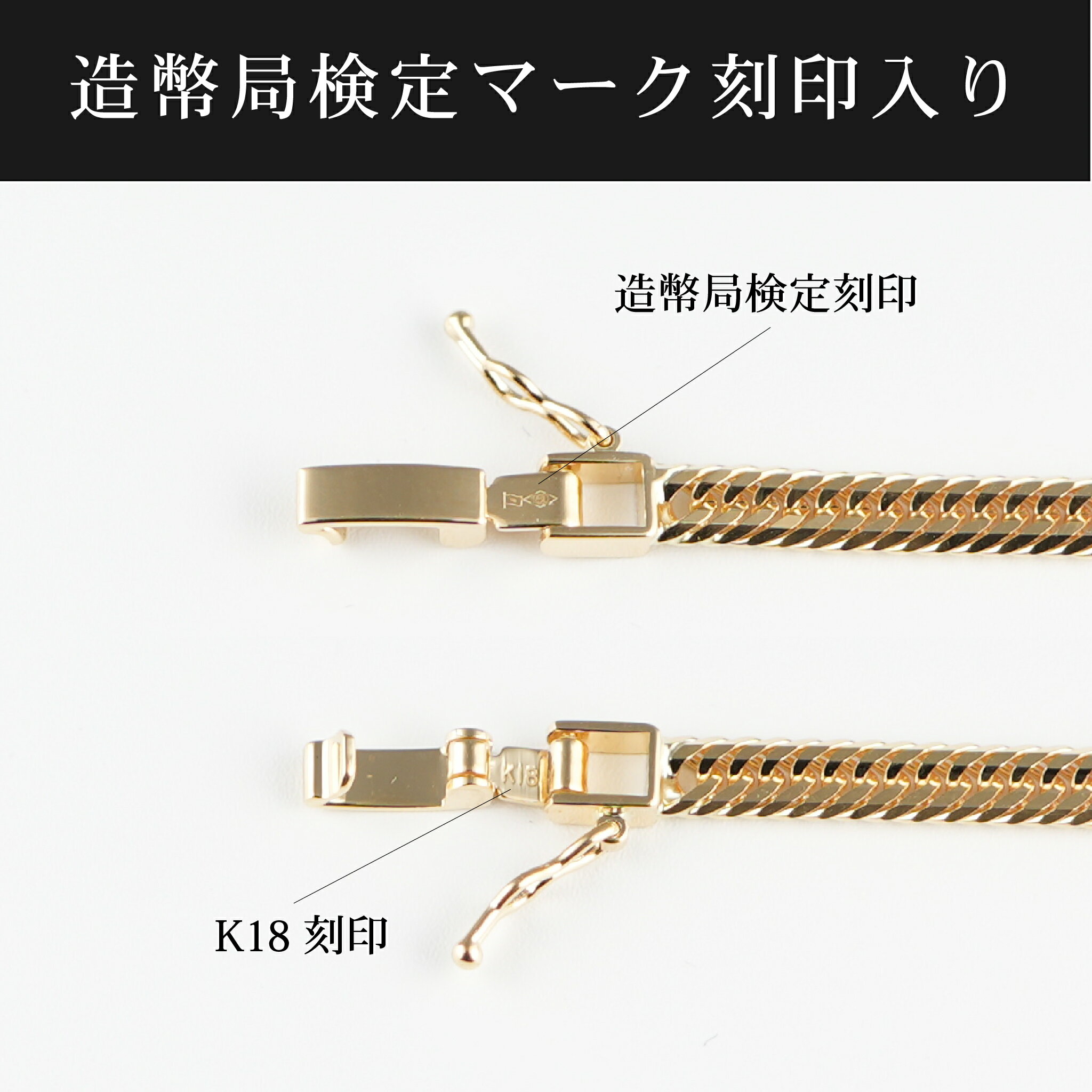 商品名 喜平 アンクレット K18 トリプル 12面 10.5g 25cm 造幣局検定マーク(ホールマーク)刻印入り 素材 K18 編み方 トリプル カット面 12面 重量 約10.5g以上 長さ 25cm チェーン 幅 :約3.8mm(平均値)厚み:約1.6mm(平均値) 金具 シングルセーフティ幅 :約5.9mm(平均値)厚み:約2.4mm(平均値) 備考 新品造幣局検定マーク(ホールマーク)刻印入り