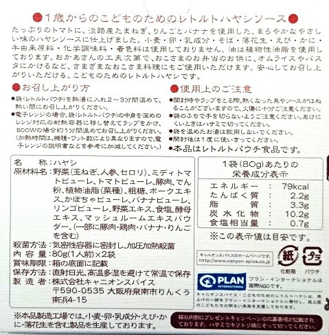 内容量:160g(80g(1人前)×2袋入り)×10箱 1歳からのこどもハヤシソース こどものためのやさしいハヤシです。 ●小麦・卵・乳成分・そば・落花生・えび・かに・牛由来原料・化学調味料・着色料不使用 ●植物性油脂使用 たっぷりのトマトに、淡路産たまねぎ、りんごとバナナを使用した、まろやかなやさしい味のハヤシソースに仕上げました。おかあさんの工夫次第でお子さまのお弁当のお共に、オムライスやパスタにかけるなど様々な料理にもご使用頂けます。 安心してお召し上がり頂ける、こどものためのレトルトハヤシです。 【お召し上がり方】 ●袋(レトルトパウチ)を熱湯に入れ2〜3分間温めて、熱い間にお召し上がりください。 ●電子レンジの場合、袋(レトルトパウチ)の中身を深めのレンジ対応の耐熱容器に移し替えてラップをかけ、500Wの場合は約1分間温めてお召し上がりください。 (加熱時間は、機種・ワット数により異なりますので、電子レンジの説明書などを参考に加減してください。) 【原材料】 野菜(玉ねぎ、人参、セロリ)(国産)、ミディトマトピューレ、トマトピューレ、豚肉、でん粉、植物油脂(菜種)、粗糖、ポークエキス、かぼちゃピューレ、バナナピューレ、リンゴピューレ、野菜エキス、食塩、酵母エキス、マッシュルームエキスパウダー(一部に豚肉・鶏肉・バナナ・りんごを含む) 【含有アレルギー情報】 ・豚肉・鶏肉・バナナ・りんご