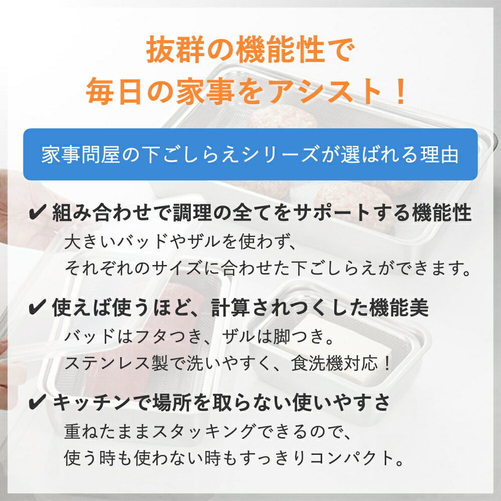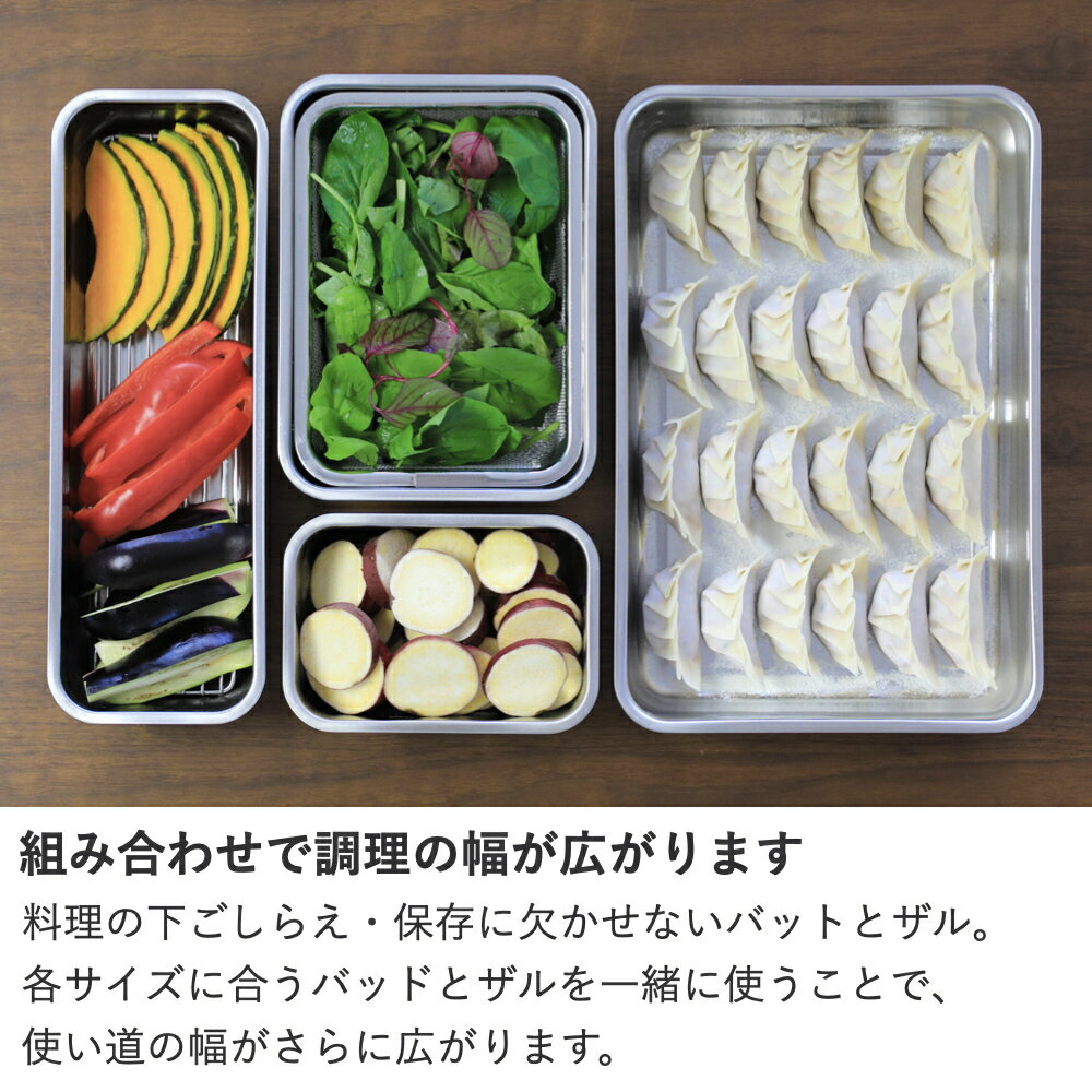 【家事問屋】システムバット&下ごしらえ角ザルセット 選べる2サイズ 1/4 1/2 料理道具 調理道具 作り置き 下ごしらえバット システムバット 角バット コンパクト 便利グッズ キッチン雑貨 ステンレス 樹脂フタ付き 日本製 燕三条 シンプル 使いやすい かじどんや
