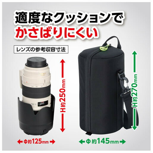 【返品種別A】□「返品種別」について詳しくはこちら□2022年02月 発売◆適度なクッションでかさばりにくい適度なクッション厚とソフトなクッション素材でかさばりにくく、持ち運びのしやすいショルダーベルト付きレンズポーチです。最大約Φ125×H250mmまでのレンズを収納可能です。◆撥水高強度ナイロン素材撥水性のある高強度のナイロン素材を採用しています。◆リングタイプの蛍光色プラー指を通してサッと開けるリングタイプのプラーは、バッグ内で探しやすい蛍光色を採用。通常のコイルファスナーよりも耐摩耗性に優れ壊れにくい、YKKの織り込みファスナーを採用しています。◆サッと開いて取り出しやすい開閉はタテ方向なので、コンパクトな動作ですぐにレンズを取り出すことができます。◆ハンドル付き背面には持ち運びに便利なハンドルを装備しています。■ 仕 様 ■参考収容寸法:約Φ125×H250mm外寸法:約Φ145×H270mm重量:約270g材質:ナイロン付属品:ショルダーベルト[KLPSF2125250]ハクバカメラ>レンズアクセサリー>レンズケース・ポーチ>純正レンズケース・ポーチ