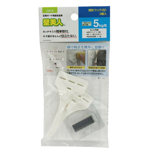 【返品種別B】□「返品種別」について詳しくはこちら□※用途以外に使用しないで下さい。※お子様の手の届かない場所に保管して下さい。※使用前に取扱説明書を読んでからご使用ください。※石膏ボード以外の壁には取り付け出来ないです。◆石膏ボード専用のホッチキスで簡単に取り付けられる時計用のフック。◆石膏ボード用固定金具。◆ホッチキスは180度開くタイプで、家庭、事務用のものをご使用ください。◆作業時間は目安として5分程です(ホッチキス針打ち込み本数はフック1個に9本です)。◆金具タイプと違い、フィルムを使用しません。◆取付、取外しが簡単で、外した穴あとが目立ちません。◆時計の他小物や額縁などを掛けることもできます。■ 仕 様 ■時計用フック:2個時計フック:ABS樹脂[CH2カベビジン]若林製作所アウトドア>DIY・工具>金物・建築資材>建築金物