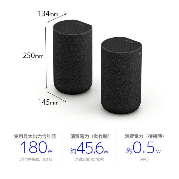 【返品種別A】□「返品種別」について詳しくはこちら□2022年05月 発売【ソニ−ブラビア冬の大還元祭】・購入期間:2025年11月14日〜2026年1月13日※対象のテレビ単品、または対象のテレビとセットでご購入いただいた方が対象となります。※詳しくは【SONY公式サイト】をご参照下さい。※対象商品とセット購入で追加キャッシュバックされる場合は、まとめて1回でご応募いただく必要がございます。メーカー保証期間 1年◆HT-A7000と接続することで、ソニー独自の立体音響技術「360 Spatial Sound Mapping」による立体音響を実現するリアスピーカーSA-RS5はHT-A7000と組み合わせて使用することで「360 Spatial Sound Mapping」による立体音響を実現します。サウンドバーとリアスピーカーからの音の波面を合成し、複数のファントムスピーカーを生成します。また、音場最適化技術により、スピーカー間や天井までの距離を内蔵マイクで自動計測し、スピーカーの置かれている空間を把握。その情報をもとに広大な音場空間を創り出し、リビングが音で満たされるような360立体音響体験を可能に。まるで映画のシーンの中にいるような圧倒的な臨場感を楽しめます。◆イネーブルドスピーカー搭載で広い音場を実現フロントにトゥイーターとウーファーを、両サイドにはパッシブラジエーターを搭載。上部にはイネーブルドスピーカーを搭載することでより立体感のある音場を生み出します。◆バッテリー内蔵で自由度の高いレイアウトが可能フル充電(*1)で最大10時間(*2)再生可能なバッテリーを内蔵。ACアダプターを気にすることなく自由度の高いレイアウトが可能です。また10分の充電で最大90分(*2)再生可能な急速充電にも対応しています。*1 約4時間(付属のACアダプター使用時)*2 周囲の温度や使用状況により、上記の時間と異なる場合があります◆ボタンひと押しでかんたんに音場補正ができるオプティマイズボタン普段とは違う場所に置いた場合でもオプティマイズボタンを押すとすぐに自動で音場補正を行うことができます。内蔵の計測用マイクと測距音でスピーカー間の距離と、天井までの距離を計測しお部屋にあわせた音場空間を自動で生成します。測距用のマイクを用意したり、別途アプリケーションを用意したりする必要もありません。◆かんたんセットアップ電源を入れるだけで対象のシアターシステムと自動で接続。かんたんにセットアップが可能です。■ 仕 様 ■【スピーカーレイアウト】スピーカー構造:ワイヤレスリアスピーカースピーカー構成:リアスピーカー【スピーカーユニット(サラウンド)】ウーファーエンクロージャータイプ:パッシブラジエーターユニットサイズ:70mm×82mmトゥイーターユニットサイズ:14mm ソフトドーム振動板素材:布上向きスピーカーユニットサイズ:46mm×54mm【スピーカーグリル】スピーカーグリル(リア)グリルタイプ(リアスピーカー):固定グリル素材(リアスピーカー):布/メタルグリル【入出力】ボタン:電源、キャリブレーション、リンク(底面)表示窓:LEDランプ【アンプ】アンプタイプ:デジタルアンプS-Master:●チャンネル数:6ch(L:3ch+R:3ch)実力最大出力(非同時駆動/JEITA):Total 180W(L:Total 90W+R:Total 90W)【付属品・その他】付属品:ACアダプター(ケーブル長:200cm※DCケーブル部)、製品登録カード、保証書、取扱説明書【外形寸法と質量】外形寸法(約)(幅x高さx奥行き):145mm×250mm×134mm質量(約):2.4kg電源:100V-240V AC電源周波数:50Hz/60Hz消費電力(動作時)(約):45.6W(内蔵充電池充電中)消費電力(待機時)(約):0.5W電源設定:ネットワークスタンバイモード電池種別:リチウムイオン電池電池持続時間:10時間急速充電(10分)時再生時間:90分充電時間:4時間キャリブレーション:●[SARS5]ソニーオーディオ>単品オーディオ/アンプ/スピーカー>HiFiスピーカー>ブックシェルフ型・まごころ長期修理保証(保証5年)[加入料:対象商品代金の5%]商品「SA-RS5」専用加入料(※加入料のみ注文不可)※対象商品と専用加入料を分けてのご注文は承れません。上記リンク先の専用加入料と一緒にご注文して下さい。※長期修理保証についての詳細・注意事項はこちらのページをご一読下さい。