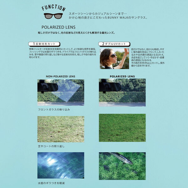 【返品種別A】□「返品種別」について詳しくはこちら□◆ワイドな視界の大きなレンズシェイプ。隙間から入る光を防ぐ、顔に沿うようなフロントデザイン。長時間のフィールドワークでも疲れにくい掛け心地の軽さ。ソフトなラバーモダンや調整可能なノーズパッドで、より快適なフィット感を。日常の紫外線対策からアウトドアまで、様々なシーンでオールマイティに活躍するシンプルで掛けやすいモデル。◆レンズカラー:SMOKE水面やフロントガラス、道路の照り返しなどによるギラつきをカット。眩しさだけを抑えるのではなく、クリアでストレスの無い視界を作りだす偏光レンズ。■ 仕 様 ■フレーム:ナイロン系樹脂レンズ:TAC偏光レンズレンズコート:キズ防止ハードコートレンズカーブ:6カーブサイズ:L可視光線透過率:21%紫外線カット率:99%以上偏光度:99%以上[BW0240FBUNNYWALK]BUNNYWALKアウトドア>フィッシング>ウェア・帽子・靴>アクセサリー