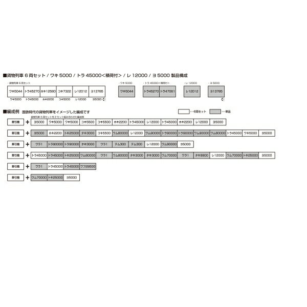 【返品種別B】□「返品種別」について詳しくはこちら□2025年12月〜2026年01月頃 発売予定※画像はイメージです。実際の商品とは異なる場合がございます。【ご予約商品をお求めの方へ】◆商品は余裕をもってメーカーへ発注しておりますが、メーカーの都合により、入荷数が大幅に少なくなる場合がございます。 この場合、早期にご注文いただいたお客様より順番に販売させて頂き、完売後はやむなくご注文を取り消しさせて頂くこともございますので、予めご了承願います。◆模型・玩具の発売日はメーカーにより発表された目安です。発売が遅れたり、大幅に延期になる場合もございます。 また、発売が中止になる事もございます。 上記の理由により、ご注文を取り消しさせて頂くこともございますので、予めご了承願います。◆同時にご注文頂いた商品は全て揃ってからのお届けとなりますので、個別での発送は承れません。 ご予約商品と発売済み商品は別々にご注文をお願い致します。◆ご予約商品は生産途中のため、外観、商品仕様、価格などが変更される場合がございます。【商品紹介】カトーのNゲージ車両 完成品、貨物列車 6両セットです。国鉄時代のバラエティ豊かな貨車から有蓋車、無蓋車、ホッパー車、冷蔵車、コンテナ車、車掌車をアソートした6両セット本セットを2セット組み合わせれば、車掌車が前後に組成された国鉄時代の貨物列車の雰囲気がお手軽に再現可能トラ45000は積荷状態を再現できる積荷カバーを付属。取り外しも可能全車、アーノルドカプラー装備。別売の単品貨車各種と連結可能ヨ5000はテールライト点灯。ダミーカプラーを付属6両紙箱に収納【セット内容】[ ワキ5044 ] + [ トラ45270 ] + [ ホキ12580 ] + [ コキ7322 ] + [ レ12012 ] + [ ヨ13785 ]【実車紹介】国鉄時代の貨物輸送は、貨車は1両単位でそれぞれ異なった目的地となる、車扱貨物輸送方式が行われていました。そのため、様々な用途や外観の貨車が、一本の貨物列車に編成されて運行されていた事などが特徴です。【商品仕様】スケール:Nゲージ商品形態:塗装済完成品車体の材質:プラスティックモーター:なしライト:テールライト点灯(ヨ5000のみ)付属品:ダミーカプラー(ヨ5000用)【別売りオプション】11-211/213 LED室内灯クリア/(電球) ※ヨ5000に取付可能鉄道模型>Nゲージ(国内型車両完成品)>貨車>無蓋車