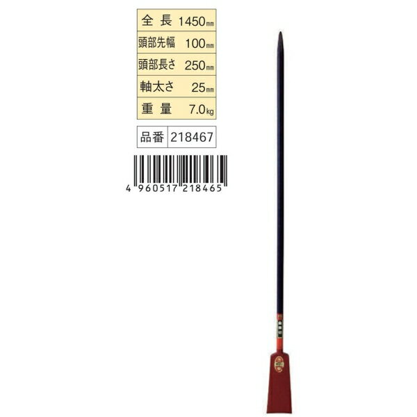 【返品種別B】□「返品種別」について詳しくはこちら□◆オールスチール製で根切り作業に最適。◆頭部に、焼入れ(強度が上がる、磨耗に強くなる)・焼戻し(弾力性が上がる)の熱処理を行っています。◆根切り、氷割り作業に。■ 仕 様 ■材質:スチール重量:7.0kg全長:1450mm頭部先幅:100mm頭部長さ:250mm軸(柄)太さ:25mm[218467]浅香工業アウトドア>DIY・工具>工事・照明用品>土木作業・大工用品
