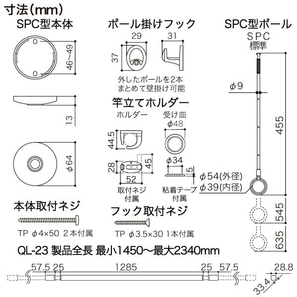 【返品種別A】□「返品種別」について詳しくはこちら□※本製品は室内専用です。屋外や浴室に取り付けてのご使用はできません。※目安重量15kg以内でご使用ください。※塗装仕上げのため金属などの硬質なものとの接触は、塗装がはがれる原因となりますのでご注意ください。※ブラック色は、埃や油汚れなどが目立つ場合があります。※竿立てホルダーは木下地に取り付けてください。(石こうボードのみの下地には取り付けないでください。)※ポール掛けフックと竿立てホルダーはホワイト色のみです。水平〜2寸勾配(11.3°)未満まではそのまま取り付けてご使用できます。2寸勾配(11.3°)以上の傾斜天井へ取り付ける場合には「傾斜天井用パーツ」、コンクリート天井に直付けする場合にはコンクリート用パーツをご使用ください。こちらの商品は地域限定で設置工事(有料)を承ります。詳しくはこちら!(HCTTで検索)QSC**品番は室内用物干金物SPC型×2本と室内用物干し竿QL型×1本のセット品となります。◆使いやすさの先にある、心地よさへ。使いやすさの先にある、心地良さへ。川口技研がオススメする【四角い物干し竿】! ! 川口技研は、「快適な暮らしを創造する」をテーマに安心・安全・使いやすさにこだわった製品づくりを続けています。そのうちの一つが使いやすさにこだわった、物干金物シリーズ「ホスクリーン」。毎日の“物干し”をもっと快適にするために、便利さを追求するだけではなく、見ていて心地の良いものを目指しました。それが、“四角い物干し竿”ホスクリーンQL型です。◆四角い形によりハンガーが竿の2点に接することで、ハンガーの向きを揃えやすくする効果があります。風通しの良い状態を保ちやすくし、衣類が斜めになりにくいので見た目にも美しく干すことができます。◆物干しの先端はやわらか素材で、脱落しにくい段差付きです。伸縮可能で、長さ調整も簡単です。耐荷重15kg。◆インテリアに調和するデザイン使用しないときにはポール部を天井から取り外せるのですっきりスマートです。◆収納パーツとして、ポール掛けフック×2、竿立てホルダー(STH-1)×1もセットしています。SPC型もQL型も、使わないときにはスマートに収納でき、室内空間をすっきりと保てます。◆サイズバリエーションのご紹介QSCS15・QSCS23:天井高210cmにおすすめQSC15・QSC23:天井高240cmにおすすめQSCL15・QSCL23:天井高260cmにおすすめSPCLL(スポット型単品のみ):天井高290cmにおすすめ※QSC15=幅95〜154cm、QSC23=幅145〜234cmに対応。◆Joshinでは、屋内用ホスクリーンの設置工事(地域限定・有料)も承っております。ホスクリーンを追加設置したい場合、天井への取付工事も弊社にご用命ください。詳しくはこちら! ■ 仕 様 ■セット内容:QL-23-BK:1本、SPC-BK(標準タイプ)×2本、ポール掛けフック×2個、、STH-1(竿立てホルダー)×1個、取付パーツSPC-BK本体ベース:φ64ポール全長(約):460-550-640mm(3段階の長さ調整可能)材質・・・・本体:亜鉛ダイカスト(メッキ仕上)・カバー:亜鉛ダイカスト(塗装仕上)・ポール:ステンレス・ポール先端:亜鉛ダイカスト(メッキ仕上)・リング:ナイロン・本体取付ネジ(木製野縁・軽天材用)、フック取付ネジ(木下地用)付属QL-23-BK全長:最小1450〜最大2340mm材質・・・・内ポール:アルミ押出形材(アルマイト+塗装)・外ポール:アルミ押出形材(アルマイト+塗装)・接続部品:ABS樹脂(塗装仕上)・キャップ:シリコーンゴム(表面コーティング仕上)耐荷重(約):15kg(洗濯物を均等に掛けた際の目安重量)SPC型取付間隔:1310〜2200mm(表記の寸法はSPC型を内ポール(段差)に掛けて使用する際の寸法です。)[QSC23BK]川口技研生活家電>生活雑貨>洗濯用品(物干し・ハンガーなど)>ハンガーラック・ワードローブ