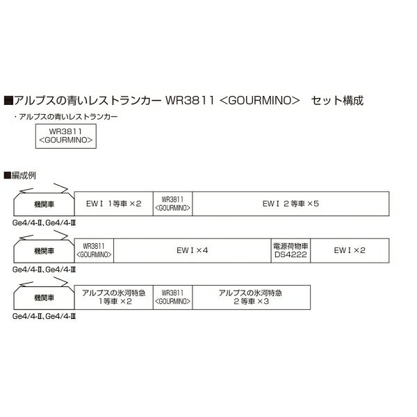 【返品種別B】□「返品種別」について詳しくはこちら□2025年03月 発売※画像はイメージです。実際の商品とは異なる場合がございます。※今回製品よりショートカプラー、ショートカプラー用ホロが標準装備となり、アーノルドカプラー、アーノルドカプラー用ホロが付属します。その他の仕様については従来製品からの変更はありません。【商品紹介】カトーの完成品Nゲージ車両、アルプスの青いレストランカー WR3811 <GOURMINO>です。2002〜2012年頃の形態を再現濃青色の車体色と金色の帯やエンブレム、ロゴ類を美しく再現テーブルランプ点灯(電球色LED採用)付属の室内灯用照明板を取り付けると、テーブルランプの光源で室内灯も点灯します(LED室内灯クリアは使用しません)。カプラーは氷河特急用ショートカプラー、ショートカプラー用ホロを標準装備。氷河特急用アーノルドカプラー、アーノルドカプラー用ホロを付属最小通過曲線半径:R150※今回製品よりショートカプラー、ショートカプラー用ホロが標準装備となり、アーノルドカプラー、アーノルドカプラー用ホロが付属します。その他の仕様については従来製品からの変更はありません。【セット内容】アルプスの青いレストランカー WR3811 <GOURMINO>【実車紹介】WR3811<GOURMINO(グルミノ)>はレーティッシュ鉄道が食堂車サービスを開始するにあたり製造された食堂車のグループで、キッチンとダイニングの両方を備えています。登場時は赤い外観でしたが、長い活躍の中で更新改造が行われ、1990年代後半にACPC(ALPINE CLASSIC PULLMAN EXPRESS)に合わせて濃青色に塗装が変更されました。現在は氷河特急の食堂車として、またEWI客車の編成に組み込まれて活躍する姿が見られます。【商品仕様】スケール:Nゲージ商品形態:塗装済完成品車体の材質:プラスチックモーター:なしライト:テーブルランプ点灯(電球色LED採用)付属品:氷河特急用アーノルドカプラー、アーノルドカプラー用ホロ【別売りオプション】11-213 LED室内灯クリア(電球色)鉄道模型>Nゲージ(外国型車両完成品)>客車