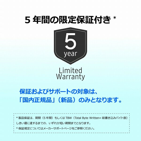 【返品種別B】□「返品種別」について詳しくはこちら□2024年11月 発売メーカー保証期間 5年製品保証は、期間(5年間)もしくはTBW(Total Byte Written=総書き込みバイト数)しきい値に達するまでの、いずれか短い期間までとなります。【ご購入後のお問い合わせにつきまして】製品に関するご質問・製品不具合等につきましては「ITGマーケティングサポートページ」へお問い合わせください。◆驚異的なスピードタスクをより速く処理します。最新のNANDフラッシュメモリを搭載した990 EVO Plusは、シーケンシャル読み出し/書き込み速度を最大7250/6300MB/s まで高速化し、巨大なファイルを瞬時に転送します。※シーケンシャルおよびランダム書き込みパフォーマンスは、Intelligent Turbo Writeテクノロジを有効にして測定されました。Intelligent Turbo Writeは、特定のデータ転送サイズ内でのみ動作します。パフォーマンスは、SSDのファームウェア、システムのハードウェアと構成、その他の要因によって異なる場合があります。※990 EVO Plusのパフォーマンスを最大限に引き出すには、Intel または AMDの ウェブサイトでシステムが PCIe 4.0 または PCIe 5.0 をサポートしているかどうかをご確認ください。◆一日を通してクールなパワーを最適化された効率、拡張されたパフォーマンス。ニッケルコーティングされたコントローラはワットパフォーマンスを73%改善させ、より少ない電力消費で熱制御を実現します。過熱やバッテリー消費を心配することなく、仕事や遊びに集中できます。◆十分な空き容量と超速体験強化された Intelligent TurboWrite 2.0でドライブのパワーを最大限に活用します。 大容量と拡張されたTurboWrite領域により、大量のデータをより高速に処理し、重いグラフィックスもスムーズに処理できます。◆Samsung MagicianソフトウェアSamsung Magicianソフトウェアは、内蔵SSD、ポータブルSSD、メモリカード、USBフラッシュドライブなどのSamsung製メモリストレージ製品をサポートする為に設計されたユーティリティソフトウェアです。最新バージョンの Magician ソフトウェアは、これまで別ソフトとして存在していたSamsung Data Migrationソフトウェア(データ移行ソフト)を統合し、ユーザーにとって包括的なソリューションに生まれ変わりました。また、大切なデータを保護し、ドライブの状態を監視し、最新のファームウェアのアップデートを入手します。◆イノベーションを生み出す原動力サムスンのNAND型フラッシュメモリは、何十年にもわたり私たちの暮らし方を変えた画期的な技術を支えてまいりました。このNAND型フラッシュ技術は、Samsung社のコンシューマSSDにも搭載され、次世代イノベーションの道を切り開いています。■ 仕 様 ■容量:1TB (1000GB)インターフェース(転送速度・規格値):PCIe Gen 4.0 x4 / 5.0 x2、NVMe2.0※本製品はPCIe 4.0 x2およびPCIe 3.0 x4と下位互換性があります。フォームファクタ:M.2 (2280) 外形寸法(L×W×H) ※最大値:80.15 x 22.15 x 2.38 (mm)NANDフラッシュ:Samsung V-NAND TLCコントローラ:Samsung社製 コントローラキャッシュメモリ:HMB (Host Memory Buffer)シーケンシャル読み出し:7150 MB/sシーケンシャル書き込み:6300 MB/sランダム読み出し:850000 IOPSランダム書き込み:1350000 IOPS使用環境温度範囲:動作時:0℃〜70℃ 非動作時:-40℃〜85℃使用環境湿度範囲:5%〜95%(結露なきこと)耐衝撃性:非動作時:1500G、0.5ms期間、3軸耐振動性:非動作時:20〜2000Hz、20GMTBF(平均故障間隔):150万時間TRIMサポート:○ ※OSが対応している場合ガベージコレクション:○S.M.A.R.T(自己診断機能):○セキュリティ:AES 256 bitフルディスク暗号化 (FDE)、TCG/Opal V2.0、Encrypted Drive (IEEE1667)保証期間:5年限定保証※製品保証は、期間(5年間)もしくはTBW(Total Byte Written=総書き込みバイト数)しきい値に達するまでの、いずれか短い期間までとなります。ソフトウェア:Samsung Magicianソフトウェア (日本語対応) ※ダウンロード対応添付品:インストールガイド&保証情報[MZV9S1T0BIT]パソコン周辺>ハードディスク・SSD>SSD(ソリッドステートドライブ)>M.2