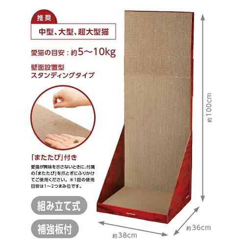 【返品種別A】□「返品種別」について詳しくはこちら□※仕様やパッケージは、リニューアルなどの理由で変更になっている場合がございます。予めご了承下さい。◆愛猫たちが最高にくつろげるように開発された、愛猫専用ウオール型スタンディングタイプの爪とぎです。◆高さがレギュラーサイズの約1.4倍のロングサイズ100cm、幅も少しゆったりサイズ。◆愛猫が立ったまま背伸びして使える、壁面設置型スタンディングタイプです。◆爪とぎ時の削りカスが飛び散りにくい構造設計になっています。◆愛猫がどこでも爪をとげるように、内側はすべて段ボールの爪とぎ素材を使用。◆愛猫が興味を示さないときに、爪とぎにふりかける「またたび」を付属しています。■材質:紙、段ボール(付属品:補強板、すべり止め、またたび)■サイズ:幅38×奥行36×高さ100cm■推奨:中型・大型・超大型猫(約5kg〜10kg)有限会社 エイムクリエイツ広告文責:上新電機株式会社(06-6633-1111)日用雑貨>ペット>猫>キャット用品>キャットタワー・ケージ・爪とぎ