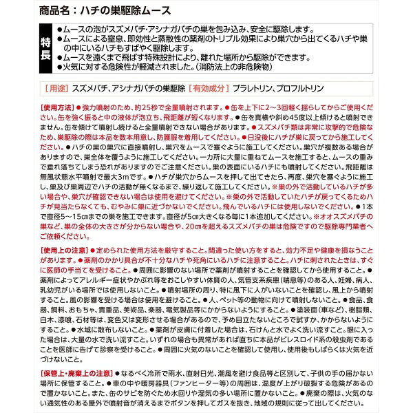【返品種別B】□「返品種別」について詳しくはこちら□※自動車・塗装面・樹脂類・石材・漆喰・白木などは、変色または変形させることがあるので、予め目立たないところで試すか、かからないようにお使いください。◆スズメバチの巣を泡のジェットで徹底駆除。◆離れた場所から処理できる。◆泡で飛ぶので処理した場所がわかる。◆効果:ハチ・スズメバチの巣の駆除。■ 仕 様 ■サイズ(約):幅60×奥行60×高さ235mm容量:300ml主成分:プラレトリン[イカリ275005]イカリ消毒アウトドア>ガーデン・エクステリア用品>害虫・害獣対策グッズ