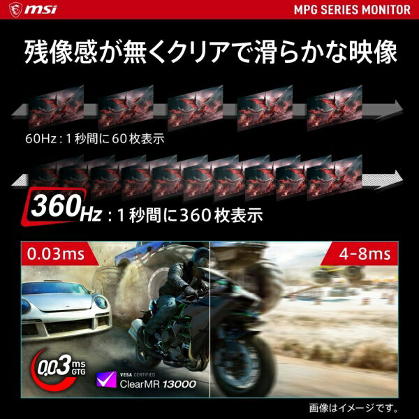 【返品種別A】□「返品種別」について詳しくはこちら□2024年03月 発売期間中対象のMSIモニターを購入し、レビュー投稿するともれなく2000円分の「えらべるPay」をプレゼント。・購入期間:2025/7/3(木)〜2026/1/31(土)詳しいキャンペーン内容、および応募方法はこちらメーカーページをご覧ください。メーカー保証期間 3年【ご購入後のお問い合わせにつきまして】購入後の初期不良・お問い合わせにつきましては、メーカーサポートへお問い合わせください。[MSIサポート窓口]電話番号:0570-093-700受付時間:9:00〜19:00(メーカー指定日を除く)■QD-OLEDパネル搭載QD(量子ドット技術)とOLED(有機EL)技術を組み合わせたQD-OLEDパネルによる圧倒的な色表現力により、今まで見たことがないような美しい映像で思う存分ゲームを楽しむことが出来ます。■リフレシュレート 360Hz一般的なモニターの約2.5倍となる最大360Hzの大幅に高いリフレッシュレートでハイエンドグラフィックボードの性能を余すことなく描写可能です。■応答速度0.03ms(GTG)今までのゲーミングモニターの常識を打ち破る圧倒的な応答速度で、動きの早いシーンでも細かな部分の輪郭をクッキリと表示することが出来ます。■OLED Care 2.0ピクセルシフトや静止画検出機能、マルチウィンドウ時の境目やタスクバーも検出など、OLEDパネルで懸念される画面の焼付きを軽減する機能を搭載しています。■Gaming Intelligence対応モニターのOSDだけでなく、Windows上でマウスやキーボードを使用してモニターの輝度やプリセットなどの設定を調整することができます。■USB Type-C Power Delivery対応USB Type-C Power Deliveryに対応しており、対応したPCやスマートフォンとの接続で最大90Wの給電と映像入力(DP Alt mode)が可能です。■カスタムヒートシンク搭載熱伝導率の高いグラフェンフィルムと専用設計のヒートシンクを組み合わせることにより、効率的な冷却を行うことができ、OLEDパネルの焼き付きを軽減します。■ 仕 様 ■画面サイズ : 26.5インチアスペクト比 : 16:9解像度 : WQHD(2560 × 1440)最大リフレッシュレート : 360Hz応答速度 : 0.03ms(GTG)パネル駆動方式 : QD-OLED表面タイプ : ハーフグレア(反射防止コーティング)最大表示色 : 約10億7300万色視野角 : 178°(H)/ 178°(V)最大輝度 : 250(ピーク時:1000)コントラスト比 : 1500000:1消費電力 : 使用時 33W / スタンバイ時 0.5W入出力端子: ・HDMI 2.1 ×2 ・DisplayPort 1.4a ×1 ・USB Type-C(DP Alt mode、USB PD) ×1 ・USB 2.0 Type-A(USBハブ) ×2 ・USB 2.0 Type-B(PC接続用) ×1 ・ヘッドホン出力 ×1本体サイズ(W × D × H): 約610 × 242 × 422(mm)本体重量 : 約8.3kg電源タイプ : 電源内蔵型電源入力 : 100 〜 240V、50 / 60Hz走査周波数 : 96.24 〜 580.32 KHz(H) / 45 〜 360 Hz(V)上下角度調整(チルト) : -5°〜 15°高さ調整 : 0 〜 110(mm)左右角度調整(スイベル) : -30°〜30°ピポット : -90° 〜 90°映像端子:最大解像度/リフレッシュレート ・DP:2560 × 1440 / 360Hz ・HDMI:2560 × 1440 / 360Hz付属品: ・HDMIケーブル ×1 ・USB Type-A - Type-Bケーブル ×1 ・電源ケーブル ×1 ・VESAマウント用スペーサーネジ ×4 ・クイックスタートガイド ×1[MPG271QRXQDOLED]パソコン周辺>液晶ディスプレイ>液晶ディスプレイ>26.1 〜 29.0型