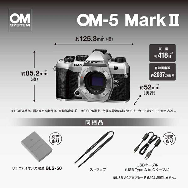 【返品種別A】□「返品種別」について詳しくはこちら□「おひとり様1点まで」2025年07月 発売Joshin web試用レポートあり!【OM-1 Mark II いいね! キャンペーン】対象期間中に対象商品を購入し、メーカーにご応募された方に「1商品あたり最大40000円分(選べるe-GIFTによる)」をプレゼント! 対象期間:2025年11月1日(土)〜2026年1月12日(月)メーカー保証期間 1年※ご注文に関しましては、お1人様1台でお願いします。複数ご購入はご遠慮ください。※転売目的や、同一住所で名前を変えてのご注文など、同一と思われるお客様より複数のご注文をいただいた場合、 ご注文をお取り消しさせていただくこともございますのでご了承ください。「M.ZUIKO DIGITAL ED 12-45mm F4.0 PRO」付属のレンズキット◆機動性に優れた小型軽量システム 「OM SYSTEM OM-5 Mark II」は、大きさ約125.3mm(W)× 85.2mm(H)× 52.0mm(D)、重さ約418g(電池、メモリカード含む)と小型軽量で機動性の高いカメラです。標準ズームレンズ「M.ZUIKO DIGITAL ED 12-45mm F4.0 PRO」と組み合わせても約672g(CIPA準拠)と、身近な風景撮影はもちろん、登山などにも持って行きやすく、その場の感動を逃すことなく捉えられます。ボディー内5軸手ぶれ補正機構を搭載し、中央最大6.5段、周辺最大5.5段、さらに対応レンズとの組み合わせによる「5軸シンクロ手ぶれ補正」では、中央最大7.5段、周辺最大6.5段の補正効果が得られます。強力な手ぶれ補正により、幅広い条件での手持ち撮影を可能にし、アウトドアで出会うさまざまなシャッターチャンスに瞬時に対応する小型軽量システムといえます。◆高画質を実現する高い基本性能 「有効画素数約2037万画素 Live MOSセンサー」や画像処理エンジン「TruePic IX」(トゥルーピック ナイン)により、自然な階調表現と高感度時でもノイズの少ない高画質が得られます。AF(オートフォーカス)には、121点オールクロス像面位相差AFを採用し、高速かつ高精度のAFを実現しています。また、本体にはUSB Type-C 端子を採用し、モバイルバッテリーからの充電・給電に対応しています。屋外でもバッテリー残量を気にすることなく使用できます。◆突然の雨など、天候が変化しても安心して撮影できる、防塵・防滴(IP53※)仕様 各部にシーリングを施し、フラッグシップモデルである「OM SYSTEM OM-1 Mark II」と同等の防塵・防滴保護等級IP53※、-10℃の耐低温という高い耐候性能を備えています。そのため、アウトドアでの突然の降雨、降雪や、滝などの水しぶきがかかる過酷な撮影条件下においても、機材の心配をすることなくシャッターチャンスに集中できます。また、世界中のプロ写真家から定評のあるスーパーソニックウェーブフィルター(SSWF)によるダストリダクションシステムを搭載しており、カメラの電源を入れる度に30000回/秒以上の超高速振動でイメージセンサー部のゴミ・ホコリを瞬時に除去します。イメージセンサーに付着したゴミ・ホコリの写り込みを気にすることなく、アウトドアでも安心してレンズ交換を行うことができ、撮影を楽しめます。※該当の防塵・防滴性能を有するレンズ装着時(レンズの規格に準じます)。また、充電中、HDMI接続中は対象外です。◆アウトドア体験を思いのままに写す、「コンピュテーショナル フォトグラフィ」ほか多彩な撮影機能 「OM-5 Mark II」は、従来PCなどを使用して後処理で実現していた合成技術を、カメラ内で処理する「コンピュテーショナル フォトグラフィ」撮影機能を搭載しています。カメラで撮影するだけで、最新のデジタル技術を駆使した新しい写真表現を実現します。本機能を手軽に使って楽しんでいただくために、CP(コンピュテーショナル撮影)ボタンを新たに設けました。CPボタンを押しながらコントロールダイヤルを回すことで、以下の撮影機能に簡単に切り替えることができます。三脚ハイレゾショット、手持ちハイレゾショット、ライブND(ND2-16)、深度合成、HDR(HDR1 2)、多重露出。ほかにも、星などの光跡撮影等では、背面モニターで途中経過を確認しながら撮影できる「ライブコンポジット」や、シャッターボタンを押した瞬間から遡って記録することで決定的瞬間を撮り逃さない「プロキャプチャー」など、多彩な撮影機能を備えています。◆その他の特長 「OM SYSTEM OM-1」シリーズ同様の新メニュー構成星空撮影をサポートする「星空AF」と「ナイトビュー」モード「手持ち撮影アシスト」機能映画のような美しい映像を手軽に楽しめる動画専用ピクチャーモード「OM-Cinema1/OM-Cinema2」動画撮影用の録画ランプ(タリーランプ)「カスタムモード」の名称設定(数字・アルファベット12文字まで設定可能)表示言語日本語のみ【付属品】・USBケーブル・ショルダーストラップ・取扱説明書・保証書・リチウムイオン充電池BLS-50■ 仕 様 ■記録媒体:SD、SDHC(UHS-I / II)、SDXC(UHS-I / II)撮像画面サイズ:17.4 mm x 13.0 mm (マイクロフォーサーズ)レンズマウント:マイクロフォーサーズマウント撮像センサー:4/3型 Live MOS センサー有効画素 約2037万画素手