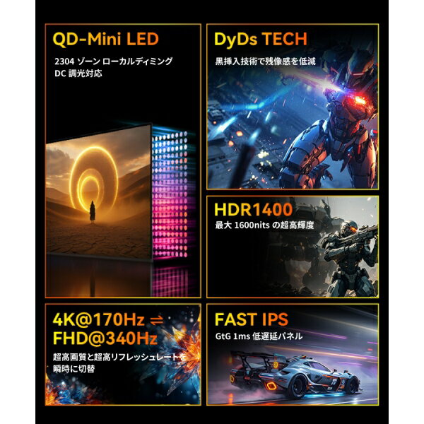 【返品種別A】□「返品種別」について詳しくはこちら□2025年06月 発売メーカー保証期間 1年※予防修理対応済みの製品です。【ご購入後のお問い合わせにつきまして 】購入後の初期不良・お問い合わせにつきましては、株式会社リンクスインターナショナル サポート窓口をご利用ください。27型4K UHD HDR1400対応ゲーミングモニター◆デュアルモード搭載 27 型量子ドット ゲーミングモニター◆27型4K UHD HDR1400対応ゲーミングモニターTitan Army P275MV MAXはMini LED、量子ドット技術を搭載し2304ゾーンのローカルディミングに対応した27型170Hz対応のハイエンドゲーミングモニターです。4K(3840×2160)の高解像度とDCI-P3 99%、Adobe RGB 99%の広色域に対応します。最大1600nits(ピーク値)の超高輝度によりHDR1400相当の性能を持ち、2304ゾーンのローカルディミングは従来のバックライトに比べ、光漏れを抑制しはっきりとした黒色を再現します。4K 170Hzだけでなく、デュアルモードによりFHD 340Hzでの超高リフレッシュレートでの動作にも対応し、素早いゲームプレイを実現します。HDMI 2.1ポートを2つ備え、最新の家庭用ゲーム機において4K 120Hz出力でのプレイ、VRR(可変リフレッシュレート機能)にも対応しています。また、独自のDyDs(ダイナミックディスプレイ)モードを備え、高リフレッシュレート時の残像感、ブレを低減し更に明瞭な動画表現が可能です。◆黒挿入技術でブレを無くすDyDsモード独自のDyDs(ダイナミックディスプレイ)モードにより高リフレッシュレート下での残像感を低減し、動きの激しい場面でも極めて明瞭な表示を実現します。◆デュアルモード 4K 170Hz / FHD 340Hz動作に対応超高精細な4K(3840×2160)解像度で最大170Hz動作に対応するだけでなく、FHD(1920×1080)解像度で最大340Hzもの高リフレッシュレートで動作するデュアルモードを搭載しています。ゲームカテゴリやプレイスタイルに応じて美麗なグラフィックスと俊敏なレスポンスそれぞれを発揮することが可能です。◆量子ドットMini LED 2304ゾーン2304ゾーンの量子ドットMini LEDを搭載し、鮮やかな発色に加えて暗いところはより暗く、明るいところはより明るく表現するローカルディミングに対応しています。映像本来の発色を忠実に表現でき、映画やゲームなどのHDR対応コンテンツに最適です。◆フリッカーフリーとブルーライトカットで目の負担を軽減DC調光方式のバックライトにより、目の疲れの原因となるフリッカー(ちらつき)を低減します。さらにブルーライトカット機能も搭載し、長時間の使用でも目の負担を軽減することが可能です。◆PBP/PIP機能に対応ディスプレイポートを1つ、HDMI 2.1ポートを2つ搭載し、置きやすく大画面な27型のディスプレイに高精細な4K解像度で様々なコンテンツを楽しめます。また、2台のPCやゲーム機を分割表示するPBP/PIP方式に対応し、左右2分割や親画面/子画面に分割して2つの映像を同時に表示することができます。◆幅広い可動調節域付属スタンドにより正確な上下昇降、ピボット、チルト、スイーベルが可能です。100×100サイズのVESAマウントに対応しています。■ 仕 様 ■パネル : 27型(FAST IPS & QDLED(量子ドット)/ノングレア/三辺べセルレス)解像度 : 4K(3840×2160)表示色 : 10億色色域カバー率(CIE1976) … ・ DCI-P3 99% ・ Adobe RGB 99% ・ sRGB 99% ・ NTSC 95%色深度 : 8bit + Hi-FRCコントラスト比 : 通常時:1500:1 / DCR時:2500000:1アスペクト比 : 16:9視野角 : 178°(H)×178°(V)最大輝度 : SDR時 450nits / HDR時 1400nits (typ.) / ピーク輝度 1600nits (max)応答速度(GTG) : 通常時5ms / OD時1ms最高リフレッシュレート … ・ 4K: 170Hz ・ Full HD: 340Hz※デュアルモードで解像度と最大リフレッシュレートが切り替わる際、アプリの再起動が必要になる場合があります※25インチモードでは、映像データ処理のために最大リフレッシュレートが低下しますHDR : HDR1400インターフェース … ・ HDMI 2.1 ×2 ・ DP 1.4 ×1 ・ USB Type-A ×2 ・ USB Type-B ×1 ・ USB Type-C 90W (HDR時45W)給電対応 ×1 ・ Audio Out ×1スピーカー : 3W×2チルト調整 : -5°〜+20°ピボット : 90°高さ調整 : 120mmスウィーベル : ±25° ケンジントンロック : -VESAマウント : VESAマウント 対応(100×100)※VESAマウンターは市販品をご用意ください主な機能 … ・ Adaptive-Sync ・ フリッカーフリー ・ オーバードライブ ・ ナイトビジョンモード(暗部補正) ・ DyDsモード(黒挿入鮮明化機能) ・ ローカルディミング(2304ゾーン対応) ・ KVM ・ PBP・PIP本体サイズ(スタンド含む) : 614mm×229mm×518mm本体サイズ(スタンド除く) : 614mm×66mm×364mm本体重量(スタンド含む) : 約6.0kg保証期間 : 1年同梱物 … ・ 本体/ベース/スタンド ・ 電源アダプタ/電源コード ・ Display Port 1.4ケーブル ・ クイックスタートガイド[P275MVMAX]パソコン周辺>液晶ディスプレイ>液晶ディスプレイ>26.1 〜 29.0型