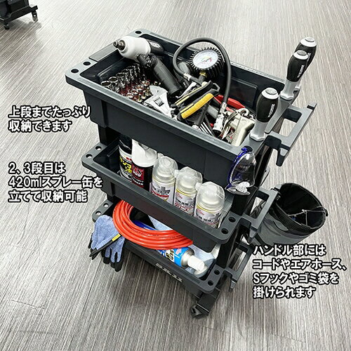 【返品種別B】□「返品種別」について詳しくはこちら□丈夫で軽く、便利な機能が満載のツールワゴンです。◆3段ボックスで収納力バツグンです。◆トップにピッタリ重なるパーツストッカー付きで、小さなものの収納もまとめて解決します。◆ボックスのフチには便利なcm目盛り付きです。◆ワゴンは自在キャスター付きで移動もラクラクです。■ 仕 様 ■ツールワゴン外寸:W490×D295×H785mmボックス部内寸:W345×D224×H123mmツールワゴン耐荷重:30kg(1段あたり10kg)ツールワゴン重量:4.3gパーツストッカー外寸:W405×D290×H78mmパーツストッカー内寸:W364×D65×H60mm(×3列)パーツストッカーは仕切15枚付きで、最大18分割ポリプロピレン[STWB490PSSK11]SK11アウトドア>DIY・工具>物流・保管用品