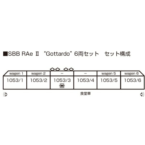 【返品種別B】□「返品種別」について詳しくはこちら□■新製品■2026年06月〜2026年07月頃 発売予定※画像はイメージです。実際の商品とは異なる場合がございます。【ご予約商品をお求めの方へ】◆商品は余裕をもってメーカーへ発注しておりますが、メーカーの都合により、入荷数が大幅に少なくなる場合がございます。 この場合、早期にご注文いただいたお客様より順番に販売させて頂き、完売後はやむなくご注文を取り消しさせて頂くこともございますので、予めご了承願います。◆模型・玩具の発売日はメーカーにより発表された目安です。発売が遅れたり、大幅に延期になる場合もございます。 また、発売が中止になる事もございます。 上記の理由により、ご注文を取り消しさせて頂くこともございますので、予めご了承願います。◆同時にご注文頂いた商品は全て揃ってからのお届けとなりますので、個別での発送は承れません。 ご予約商品と発売済み商品は別々にご注文をお願い致します。◆ご予約商品は生産途中のため、外観、商品仕様、価格などが変更される場合がございます。【商品紹介】カトーのNゲージ外国型車両 完成品、SBB RAe II “Gottardo” 6両セットです。2003年頃に「TEE」時代の形態に復元された編成を製品化空力学的デザインの先頭部をはじめ、4基パンタグラフの動力車と、独特なスタイリングをリアルに再現復活塗装をはじめ、各種ロゴマークや表記類を美しく表現スリ板部分の形状が異なる2種類のパンタグラフを新規部品により作り分けて再現食堂車のランプシェード点灯ヘッドライト点灯(電球色LED採用)中間連結部はいずれも伸縮幌式カプラーで、リアルな連結面間隔を再現スロットレスモーター採用で、静粛かつスムースな走行が可能DCCフレンドリー6両ブックケースに収納【セット内容】[ 1053/1 ] + [ 1053/2 ] + [ 1053/3(M) ] + [ 1053/4 ] + [ 1053/5 ] + [ 1053/6 ]【実車紹介】RAe IIはスイス国鉄(SBB)の国際列車専用の交直流電車です。1960年代に登場し、チューリッヒ〜ミラノ間の「ゴッタルド」をはじめとした一等国際列車「TEE」(Trans Europ Express)として活躍しました。のちに格下げ改造と塗色変更が行われ「ユーロシティ」として1999年頃まで運転されました。引退後はスイス国鉄の歴史的車両として認定され、2003年頃に1編成が一部機器類などを更新の上で「TEE」時代の姿に復元されました。現在もイベント列車として活躍しています。【商品仕様】スケール:Nゲージ商品形態:塗装済完成品車体の材質:プラスティックモーター:ありライト:ヘッドライト点灯(電球色LED採用)、食堂車のランプシェード点灯付属品:なし【別売りオプション】11-213/214 LED室内灯クリア(電球色)/(6両分入)鉄道模型>Nゲージ(外国型車両完成品)>電車