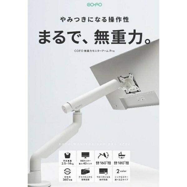【返品種別A】□「返品種別」について詳しくはこちら□2024年12月 発売メーカー保証期間 1年【COFO(コフォ)製品のお問い合わせにつきまして】ご購入前のご質問、ご購入後の初期不良・不具合などのアフターサポートにつきましては、下記窓口にご連絡ください。TEL:03-5809-1730 営業時間 10時〜17時 (土・日・祝日・年末年始を除く)COFO CONTACT お問い合わせ・サポート※初期不良につきましては、メーカーにて直接対応させていただく場合もございます。◆指1本でスイスイ動く滑らかさと、ブレない安定感。無重力モニターアームProは指一本で、上下左右の調整が自由自在。スイスイ動かせるのに、好きな位置でピタッと止まりブレない。◆気持ち良い所で、ピタッと止まるキープ力。従来のものは六角ネジを何度も回さないと調整できないものが多く、気持ちの良いところでピタッと止まってくれませんが、COFOは調整方法が非常にシンプルでノブを回すだけ。快感を感じるほどピタッと止まります。◆高い安定性を生む、ダブルメカニカルスプリング式。上下左右に頻繁にディスプレイ位置を調整する方にもオススメのメカニカルスプリング式をさらにパワーアップ、ダブルのバネで更に繊細かつ安定した位置調整が可能に。◆余分な要素を削ぎ落とし、JAPANブランドならではの繊細さと美しさ日本の伝統技術「木組み」を連想させる、繋ぎ目が少ないシームレスなデザイン。◆配線収納は簡単。カバーをスライドで取り外すだけケーブルの逃げ道確保は極めて簡単、下に向けてのカバーをスライドするだけ! なので、配線を収納しても見た目スッキリ。配線を増やしても、簡単に収納できます。◆工具不要、手でモニターの保持力(トルク)調整が可能上下調整のストレスゼロ。工具は不要、手動でモニターの保持力(トルク)調整が可能に◆デスクとの接触面には傷つけない工夫クランプのデスクへの接触面にはシリコンを使用。(※すべての傷等を防ぐものではございません。)◆大画面も360°ぐるりと軽々。タテもヨコも自由自在。◆デスク上を縦横無尽できる、広い可動域。■ 仕 様 ■対応サイズ・・・・天板の厚さクランプ式:10-50mmクロメット式:10-55mm・VESA規格75? 75mm / 100? 100mm素材:スチール、アルミ合金、ABS樹脂、POM樹脂サイズ:567? 115? 592mm重量:約3.5kg耐荷重:約2.5-14kgモニターサイズ:17-40インチ[CMAP1B]パソコン周辺>液晶ディスプレイ>関連商品>モニターアーム・スタンド